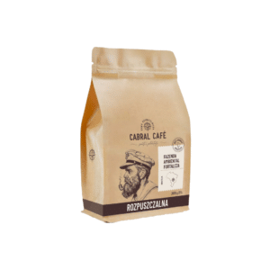 CABRAL CAFE Fazenda Ambiental Fortaleza to rzemieślnicza kawa rozpuszczalna, która wyróżnia się łagodnym ale złożonym profilem smakowym. Dominują w niej nuty gorzkiej czekolady, przełamane słodyczą przypominającą cukier trzcinowy, a całość uzupełniają akcenty wiśni oraz owoców.