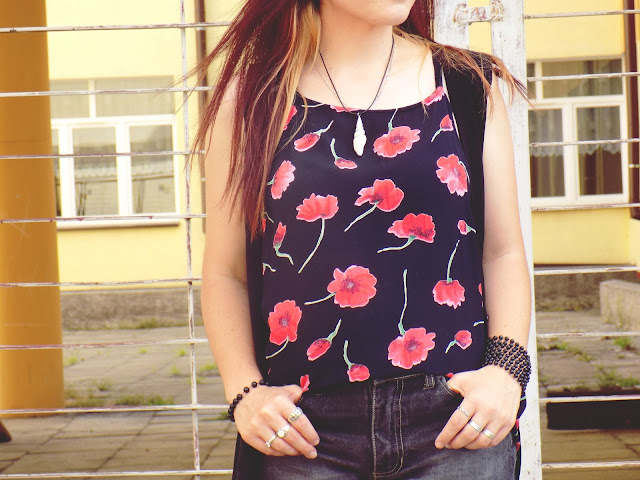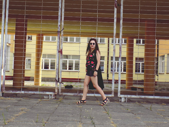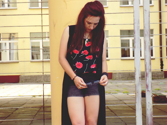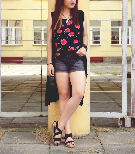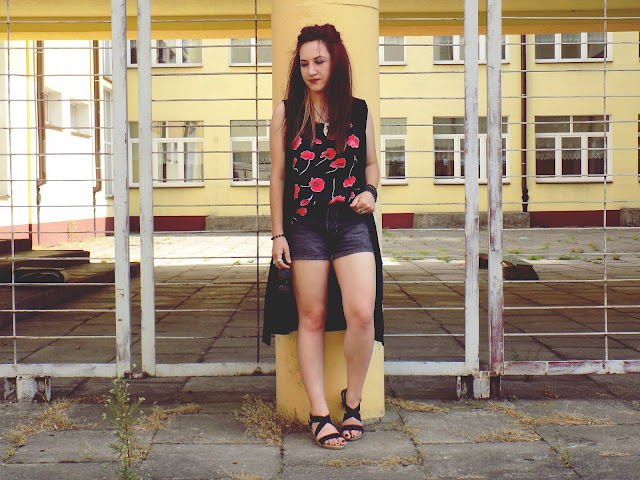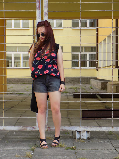 główną role gra tu " bluzka " która była sukienką ;) postanowiłam ją przerobić ponieważ w sukienkach niezbyt czuję się komfortowo ,a iż print w maki jest świetny a dodatkowo bardzo fajny i przewiewny materiał idealnie nadaję się do szortów w takie piękne i słoneczne dni jak dotychczas :)