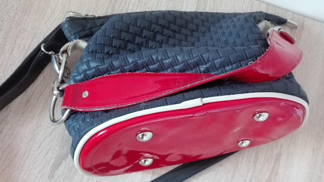 czerwonym, lakierowanym paskiem i takimże denkiem.