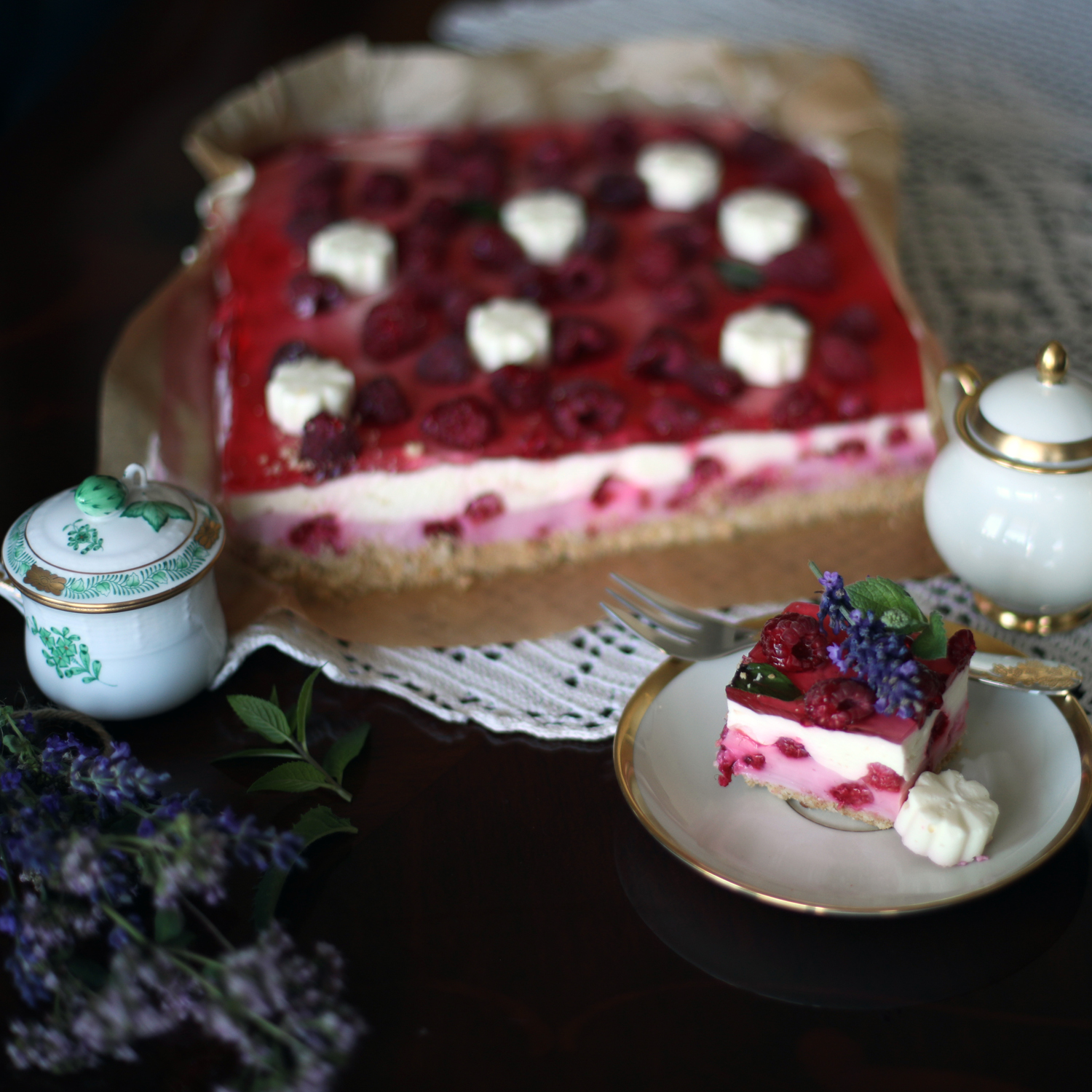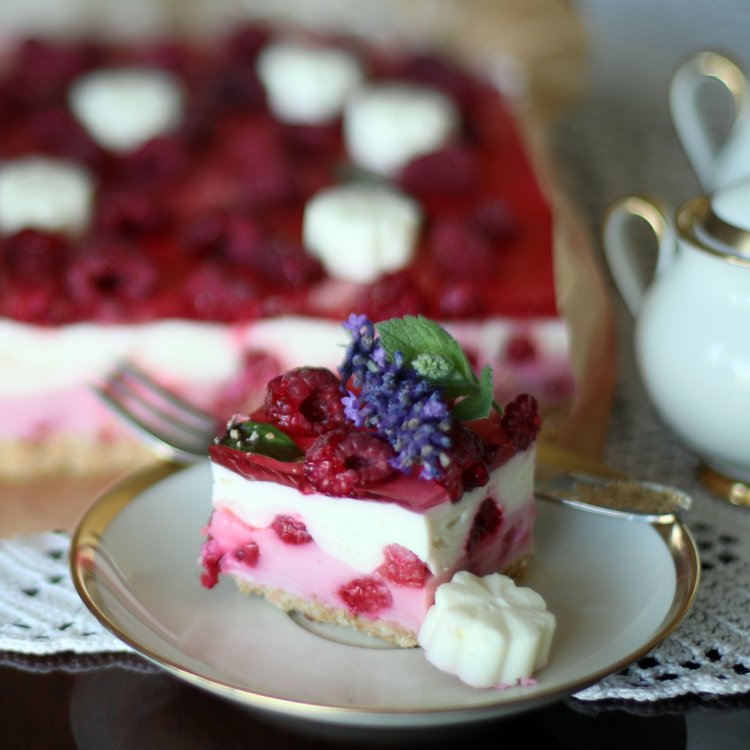 4. Góra: na koniec rozpuść w dwóch szklankach gorącej wody dwie malinowe galaretki, dodaj ksylitol. Odstaw do ostygnięcia na 15 minut a gdy galaretka zacznie tężeć, wylej ją na górę sernika. Posyp malinami. Ciasto wstaw do lodówki na całą noc.