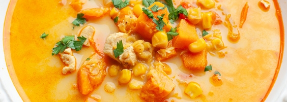 Rozgrzewająca zupa z dynią i kurczakiem, doprawiona w stylu meksykańskim: kminem rzymskim, mieloną papryką - ostrą i słodką, oraz oregano. Oprócz wspomnianej dyni i kurczaka zupa zawiera też marchewkę, pomidora, soczewicę oraz kukurydzę. Bogata jest więc w różne kolorowe warzywa :)