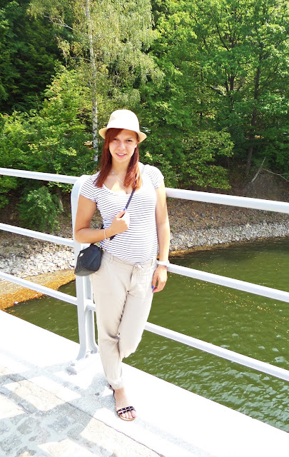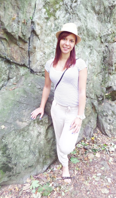 Jeśli chodzi o samą stylizacje postawiłam na stonowane kolory. Beżowe, zwiewne spodnie są moimi faworytami tego lata. Połączyłam je z białą koszulką w paski, czarnymi sandałkami ze złotymi dżetami oraz czarną małą torebką, która pomieści to co najważniejsze czyli telefon i portfel. Kapelusz jest moim pierwszym od czasów dzieciństwa jednak jak tylko go kupiłam, wiedziałam iż to strzał w 10 :)