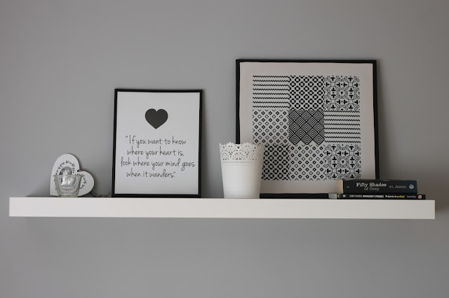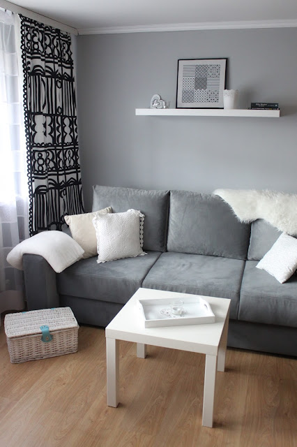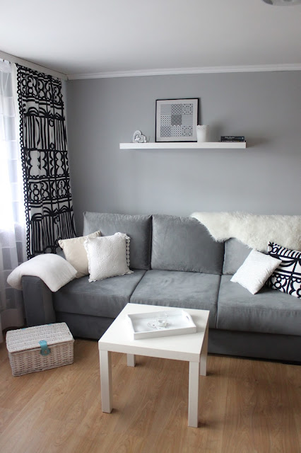 Wiele z was pytało skąd mam zasłony- tak więc odpowiadam- kupiłam je w Ikei na dziale materiałów. Również w Ikei kupiłam tymczasowy stolik za 19,90 zł, białą półkę za 39,90zł i kudłaty dywanik. Ramkę z wzorkami wyhaczyłam w Pepco za 9,90, a tą drugą którą możecie zobaczyć na dalszych zdjęciach (ramka z napisami) znalazłam na promocjach w Jysk za 12 zł. Również z Pepco mam tacę, która często przydaje się na kawę i przekąski:)