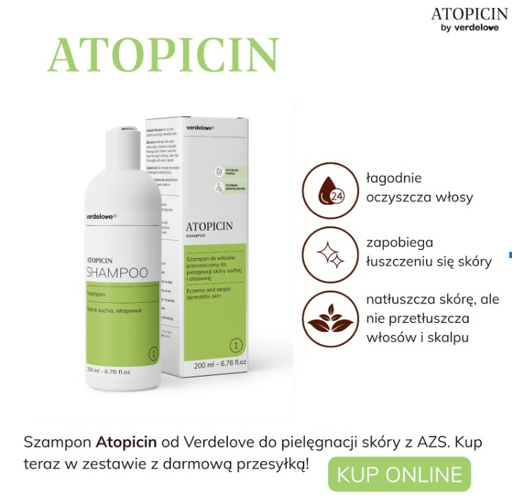 Skalp dotknięty AZS wymaga codziennej pielęgnacji opartej na delikatnych składnikach, które nawilżają, łagodzą podrażnienia i świąd oraz wspierają odbudowę bariery hydrolipidowej. Regularne stosowanie szamponu z linii Atopicin Verdelove wspiera równowagę naskórka, pozwala zmniejszyć uczucie napięcia i pieczenia, a jednocześnie ułatwia utrzymanie włosów w dobrej kondycji. Wypróbuj również inne dermokosmetyki z tej linii, które łączą humektanty, emolienty oraz substancje kojące, tworząc spójną kurację pielęgnacyjną.