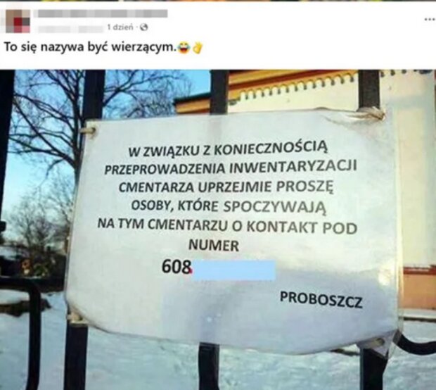 Na ogrodzeniu przed kościołem pojawił się komunikat podpisany przez duchownego, w którym znalazła się prośba o kontakt telefoniczny skierowana do osób „spoczywających na tym cmentarzu”. Choć intencja była czysto administracyjna, dosłowne sformułowanie nadało ogłoszeniu absurdalny, a momentami wręcz komiczny wydźwięk. Podpis proboszcza tylko spotęgował wrażenie, iż sprawa jest jak najbardziej oficjalna.