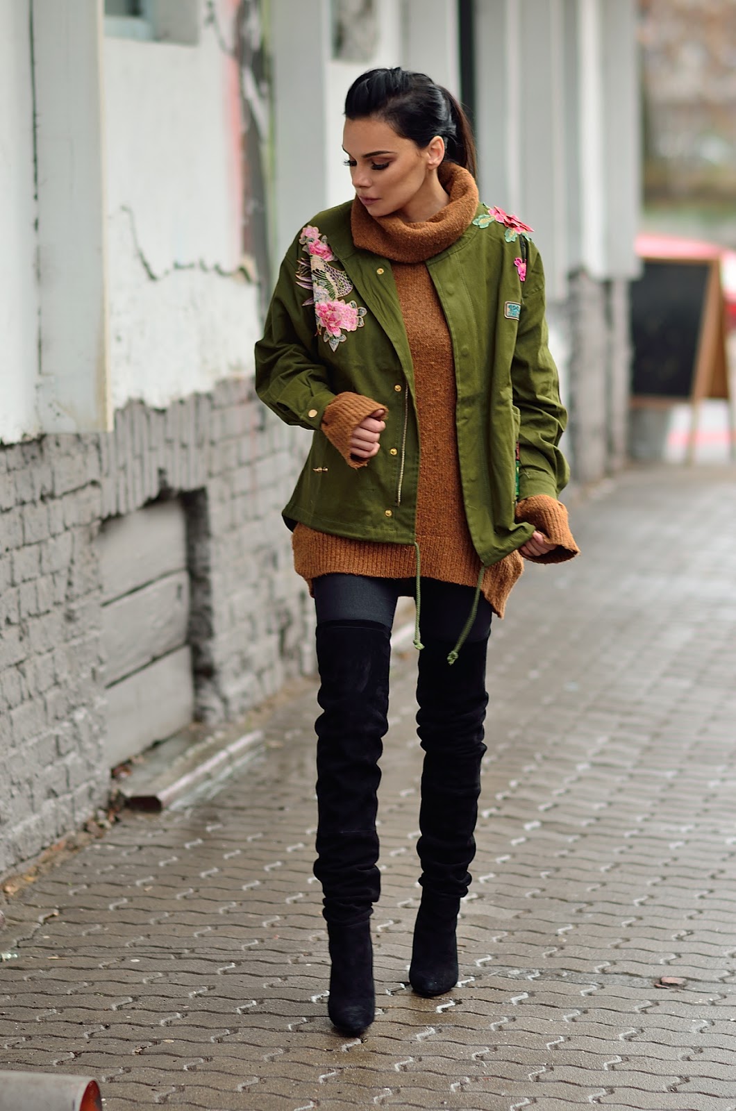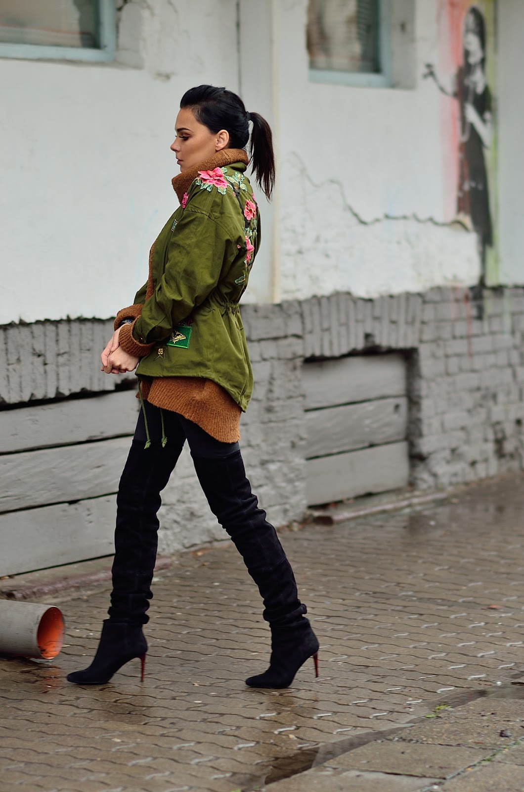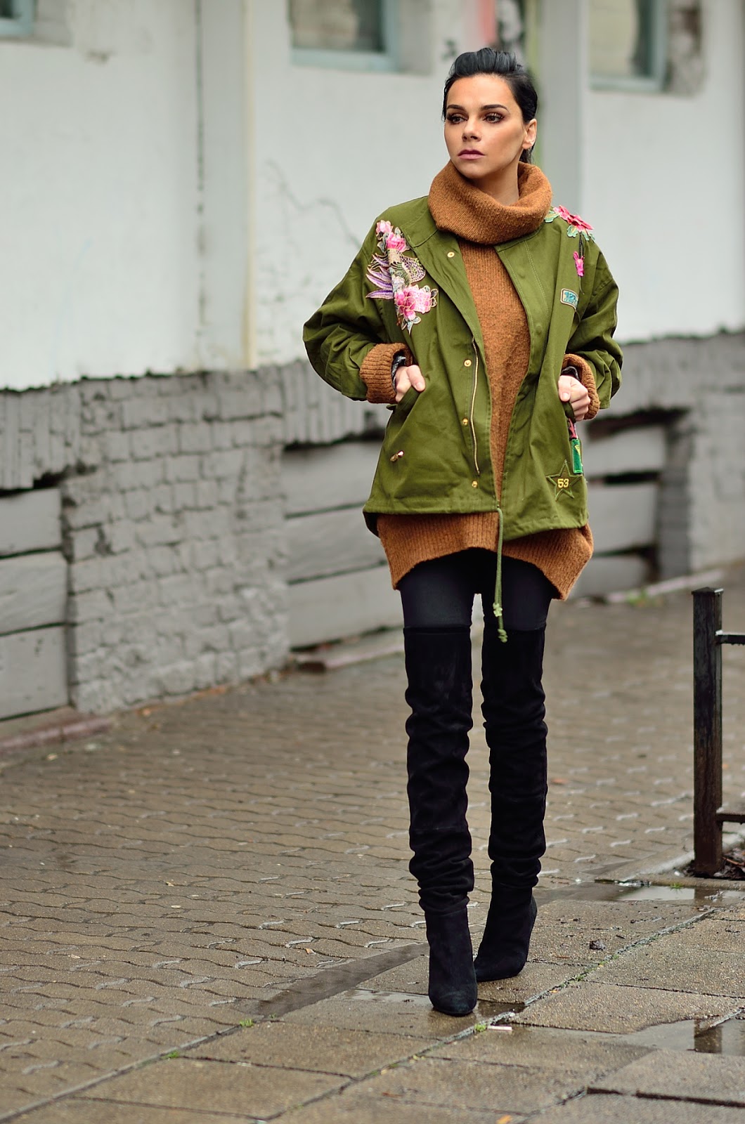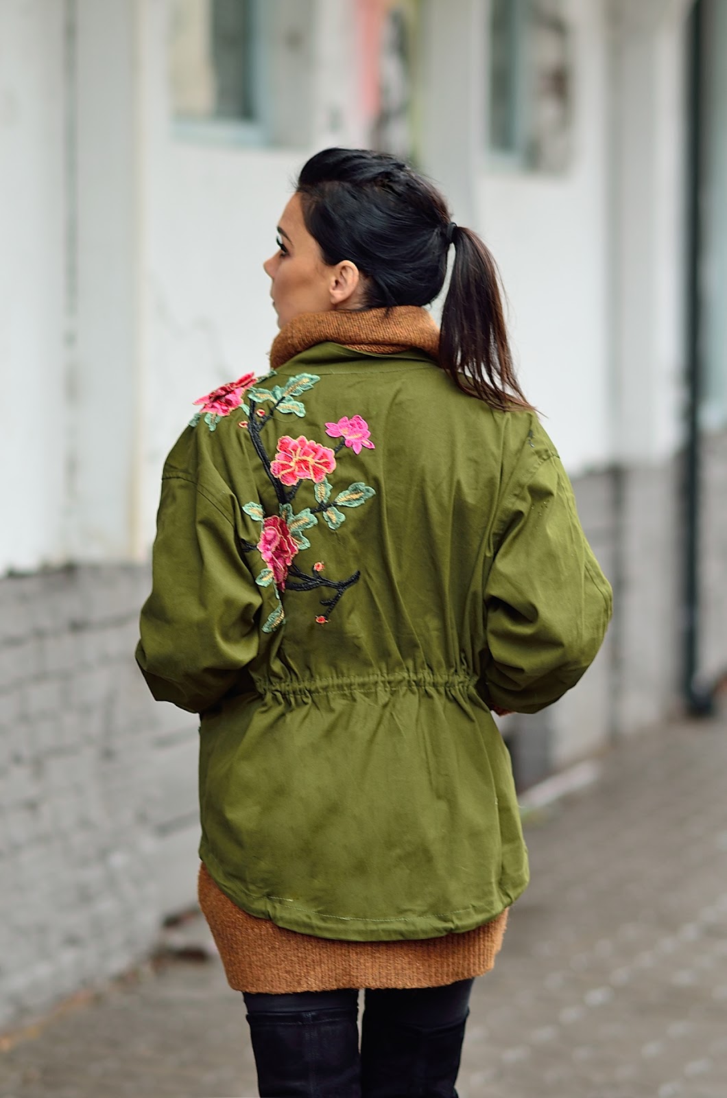 Embroidered Stand Neck Rivet Patchwork Coat -here