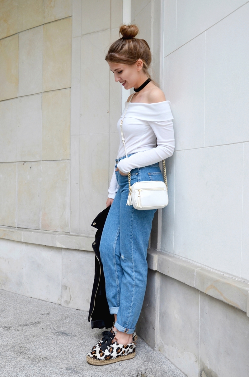 Na potrzeby dzisiejszego zestawu jeansy postanowiłam pożyczyć nie od chłopaka, ale od mamy... no może nie dosłownie, ale faktycznie zamiast boyfriendów wybrałam mom jeans, które w tym sezonie przeżywają prawdziwy renesans. Bluzkę bez rękawów wymieniłam natomiast na tę bez ramion (po polsku brzmi to bardzo głupio - angielska wercja off the shoulder zdecydowanie lepiej, nie sądzicie?). Zaś zamiast fikuśnych klapek na obcasie sięgnęłam po równie fikuśne trampko-espadryle w panterrrrę. I ta daaaaa! Zestaw gotowy :)