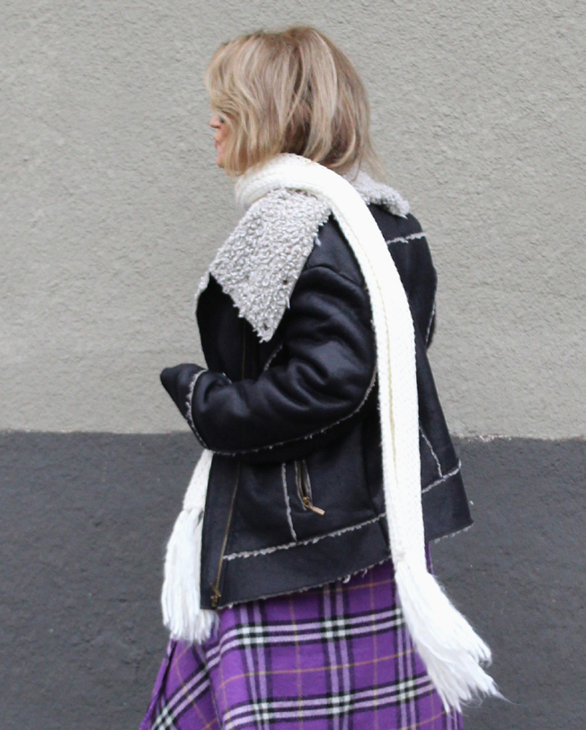 Ta stylizacja wyzwaniowo jest całkiem przypadkowa. Dziś miała się pojawić zupełnie inna, która będzie na blogu następnym razem. Natomiast owładnięta chwilową słabością do koloru lilakowatego, co było do zaobserwowania ostatnio na moim fb i insta, przelatując lumpeksy, poszukiwałam szala, który pasowałby mi do lilakowato-biało-beżowych zestawów. Niestety nie wiem, czy ze mną się coś porobiło, czy z zaopatrzeniem lumpeksów, albo może z popytem w stosunku do podaży, ale mam poważny problem ze znalezieniem czegokolwiek fajnego. Może jest to ratunkowe dla portfela i szafy, ale bardzo frustrujące. Wychodziłam już zdegustowana z ostatniego sklepu, gdy z kłębowiska różnych szalików i chustek łypnęła na mnie ta krata. Trochę mi zajęło usamodzielnienie jej bytu i ku mojej euforii okazało się, iż jest cała i zdrowa. W domu zauważyłam, iż szal jest wystarczająco szeroki i długi, by spróbować wykorzystać go jako spódnicę. Podeszłam do tego z wielką nieśmiałością, ponieważ bardzo mi się podoba takie rozwiązanie, ale uważam, iż jest to pomysł raczej dla szczuplaków, bynajmniej nie dla okrąglaków. Ostatnio podziwiałam taką spódnicę na Margotce, która wyglądała w niej wspaniale. Jestem pewna, iż gdyby nie jej inspiracja, nie podjęłabym się tej karkołomnej próby. Spięłam szal agrafką i okazało się, iż kiedy poruszam się dynamicznie, mydląc oczy zawieruchą, wygląda choćby na mnie całkiem dobrze, co ważniejsze, nie odpina się i nie spaduje ;) Reszta tej stylizacji jest już konsekwencją lilakowatą, czyli takowy sweter i torba, plus oczywiście białe dodatki, buty i szal. Żeby nie zasłonić tej dziwnym trafem powstałej spódnicy, dobrałam do niej krótki kożuszek. Przepraszam za brudne buty, ale w ciemnych okularach jestem ślepa i nie widzę kałuż z błotkiem. No i brawa dla mnie za trendowatą determinację graniczącą z desperacją, gdyż mimo poważnej zmiany proporcji mojej osobistej szerokości do długości, występuję przed Wami odważnie w obuwiu całkiem plaskatym, zamiast spróbować się wywyższyć nieco, a to, dlatego iż jest wygodne i bezpieczne - argumenty pod publikę ;) no i przede wszystkim trendowato, i podobno ohydnie kiczowato BIAŁE! :))