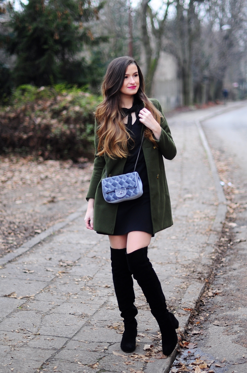 Dzisiejsza stylizacja w iście jesiennym klimacie :) Khaki, czyli brudna zieleń, w połączeniu z czernią i szarością. Wydawać by się mogło dosyć nudno, natomiast dzięki różnym fakturom poszczególnych ubrań i dodatków, wcale tak nie jest. Główną rolę w tym zestawie odgrywa welurowa torebka, która w połączeniu z klasyczną sukienką z wiązaniem
