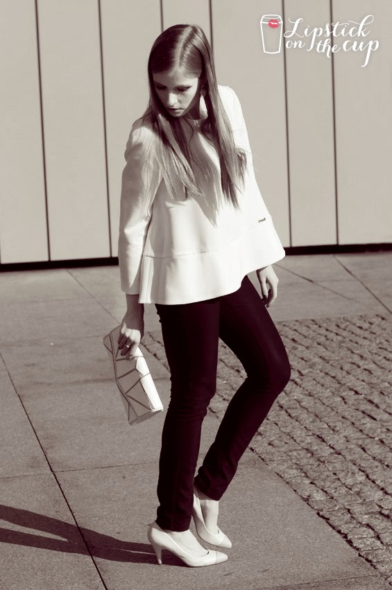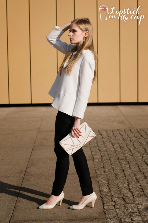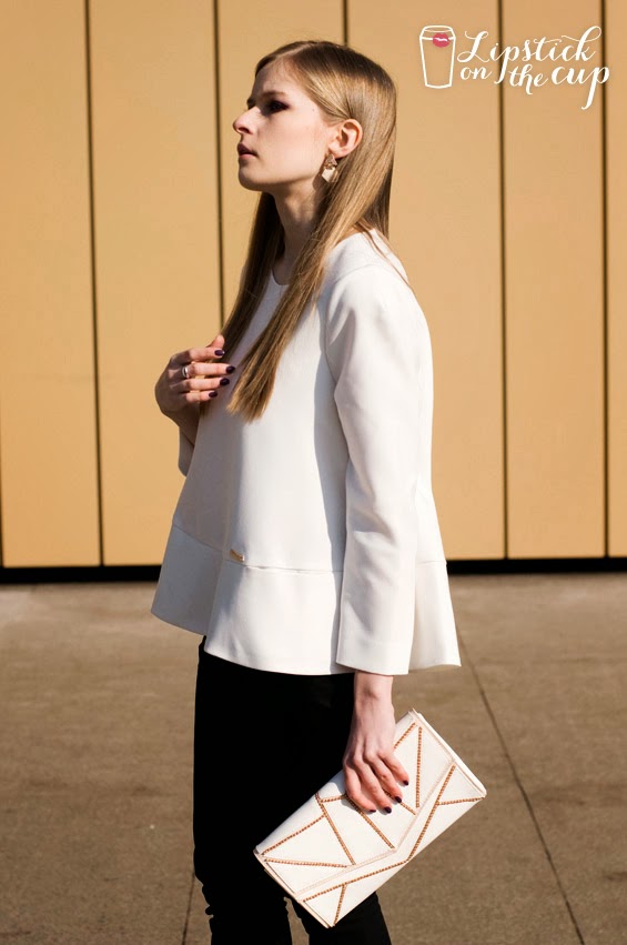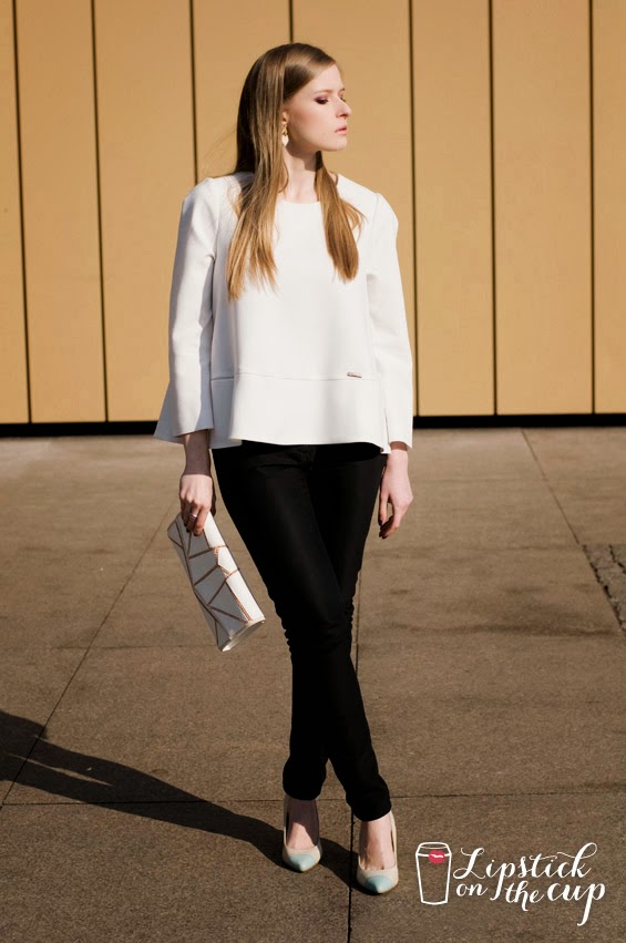 The sunny weather has inspired me to create the first in this year more spring-ish outfit. I feel the best in classic clothes so I decided to put together white, flared cut blouse with black trousers and wear cream and gold earrings and also clutch in the same shades. My creamy heels with the pointed blue toe cap added a bit of color to this look. I hope this amazing weather will last as long as possible!