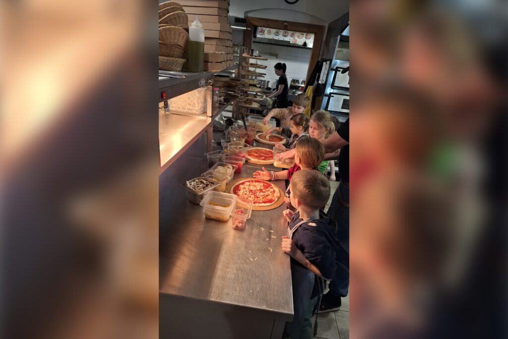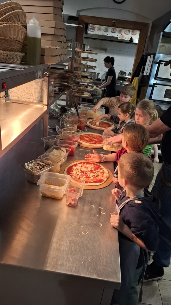 Uczestnicy półkolonii wzięli też udział w warsztatach kulinarnych „Pieczenie pizzy”. Podczas zajęć dzieci miały okazję samodzielnie przygotować pizzę, poznając kolejne etapy jej powstawania – od wyrabiania ciasta, przez dobór składników, aż po pieczenie. Zajęcia rozwijały kreatywność, samodzielność oraz zachęcały do próbowania nowych smaków. Była to również doskonała okazja do integracji i wspólnej zabawy w atmosferze pełnej euforii i aromatu świeżo wypieczonej pizzy. Dla wielu uczestników było to pierwsze kulinarne doświadczenie tego typu, które być może stanie się początkiem nowej pasji.