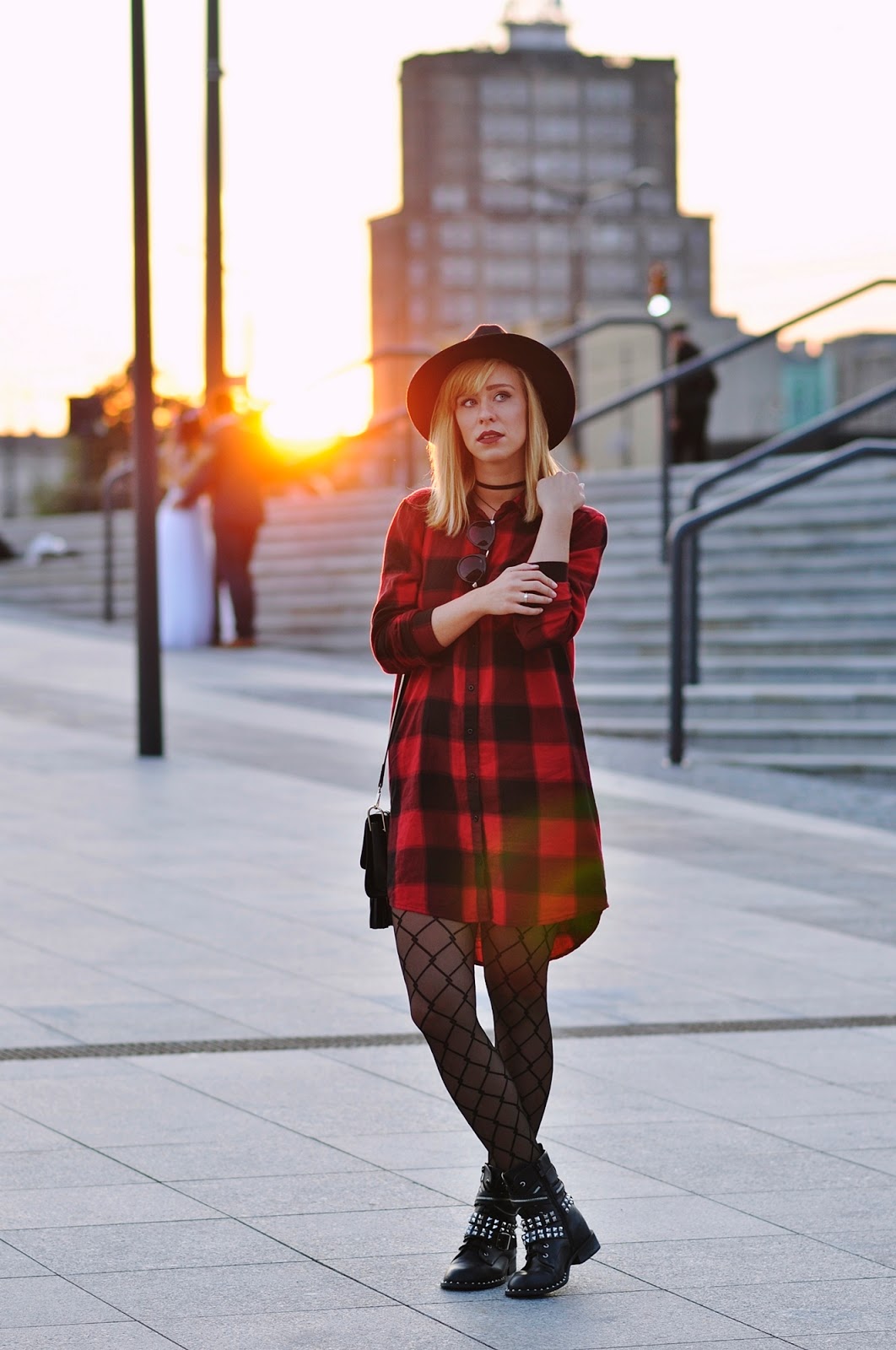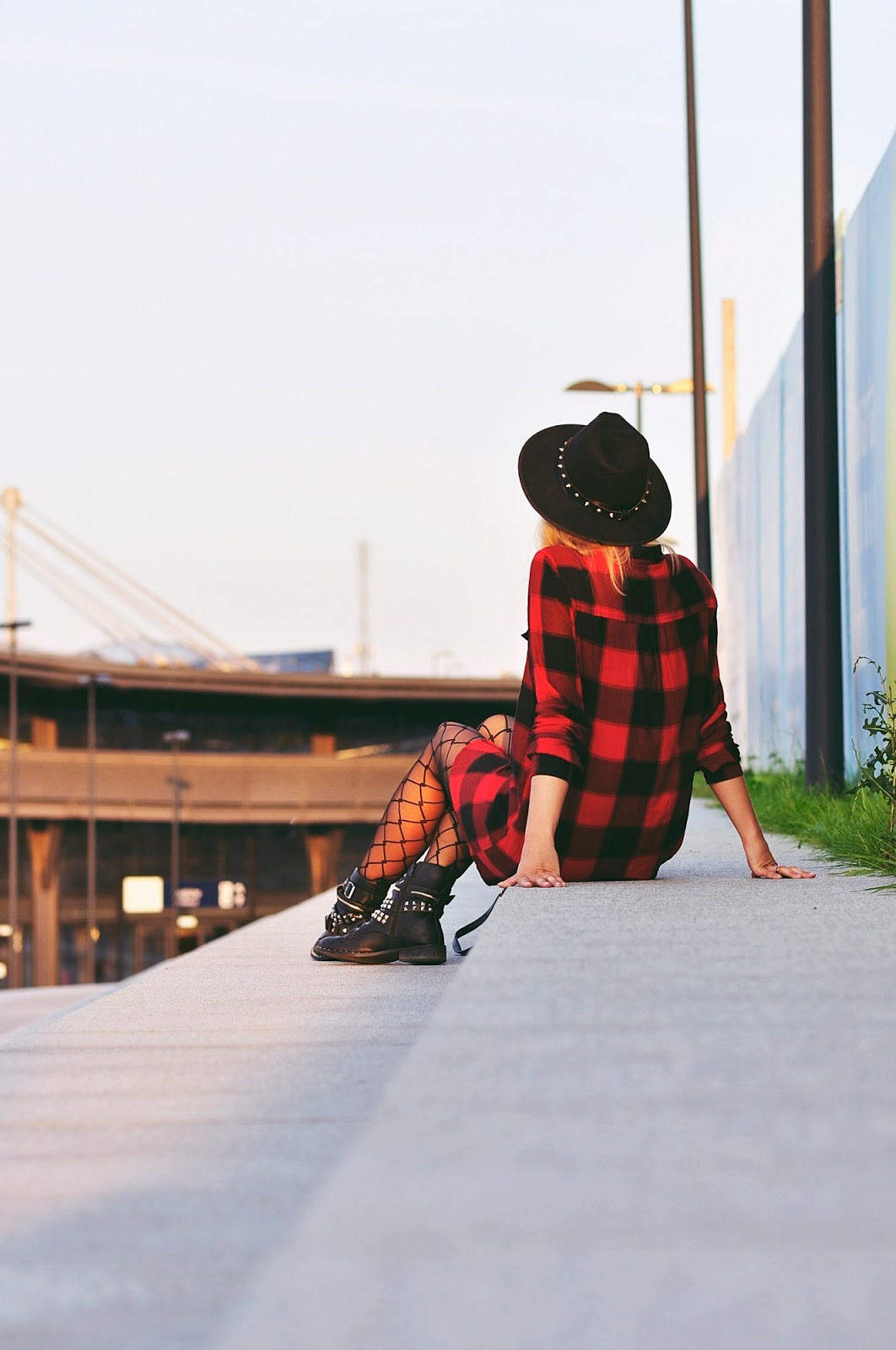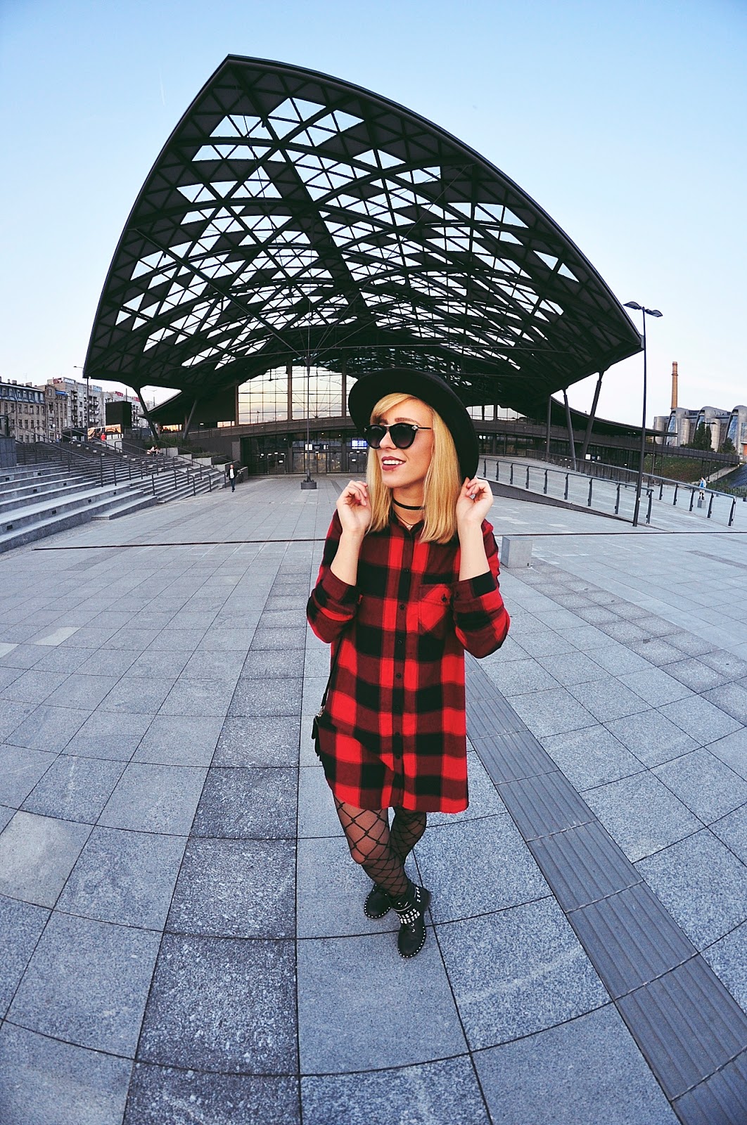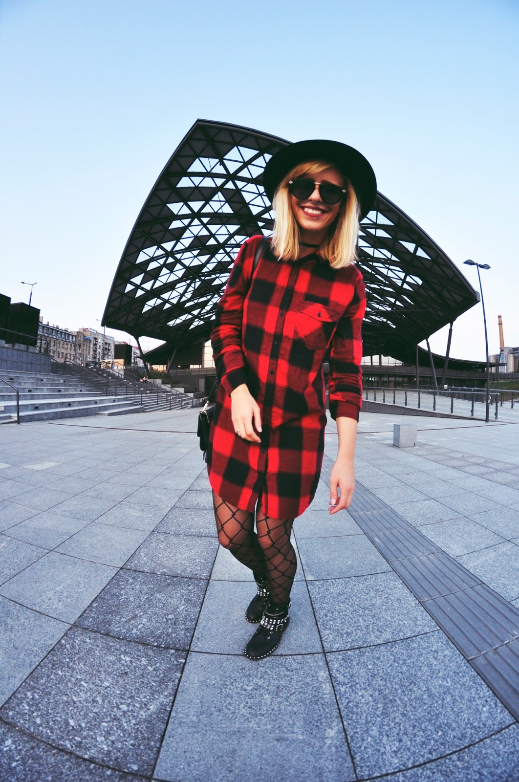Przechodząc do stylizacji! Od kiedy pamiętam mam słabość do kraty, szczególnie tej czerwonej, dlatego też kiedy zobaczyłam w Cropp'ie tę sukienkę, nie mogłam przejść obok niej obojętnie (pomijając fakt, iż tego samego dnia kupiłam tam koszulę w prawie identyczną kratę - uwiódł mnie napis na plecach). Taki kraciak nadaje się idealnie do grungowo-rockowych klimatów, w których czuję się jak ryba w wodzie, wystarczy trochę czerni, mocne buciory i zestaw gotowy. Stylizację pstrykaliśmy jeszcze w Polsce, Łódź Fabryczna okazała się świetnym miejscem na zdjęcia i to z pewnością nie tylko moje zdanie, podczas naszej 'sesji', odbywały się tam jeszcze dwa plenery ślubne.
