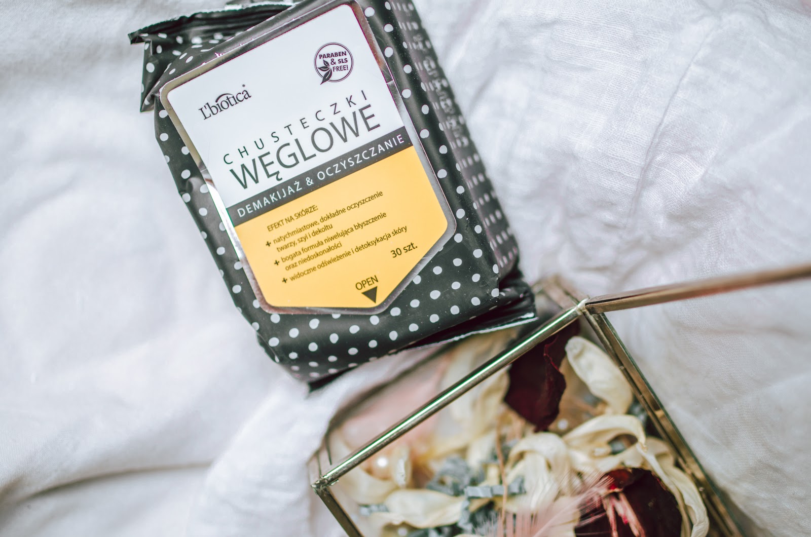 Ostatnim produktem są chusteczki do makijażu z węglem, kolagenem i ekstraktem z ryżu marki L'biotica. Chusteczki mają za zadanie skutecznie usuwać makijaż. Pozostawiają skórę oczyszczoną, odświeżoną i dogłębnie idealnie nawilżoną. Najbardziej lubię takie chusteczki na wyjazdach, w domu zmywam makijaż w tradycyjny sposób wacikiem też ze względu na dużo niższy koszt. A takie chusteczki podczas wycieczek, wakacji itp są z kolei bardzo wygodne.
