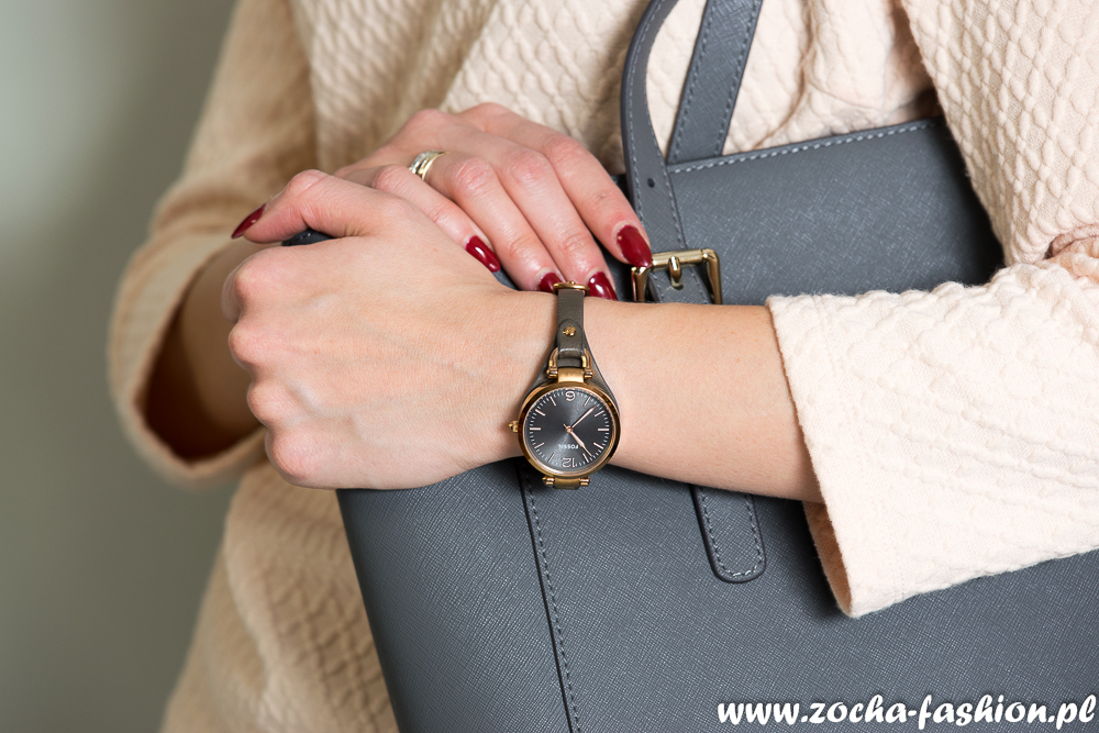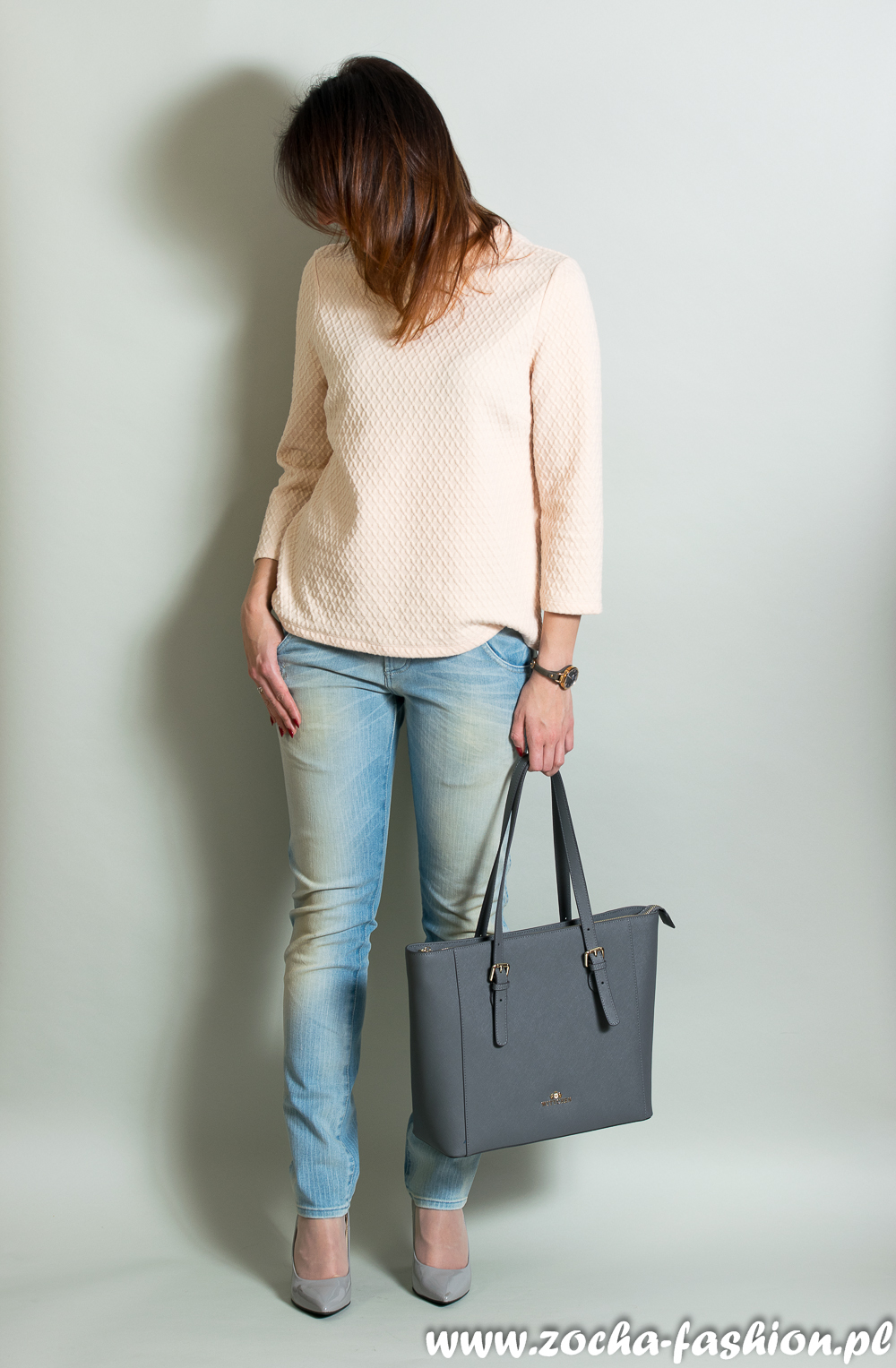 Stylizacja składa się z pięknej, jasno-pudrowej bluzeczki o ciekawej fakturze. Dół to jasne, przecierane, jeansowe rurki (uwielbiam je). Dodatki to jasno szare, lakierowane, klasyczne czółenka, zegarek i torba w bardzo podobnym odcieniu co obuwie. Nic prostszego, ale w prostocie jest piękno :)