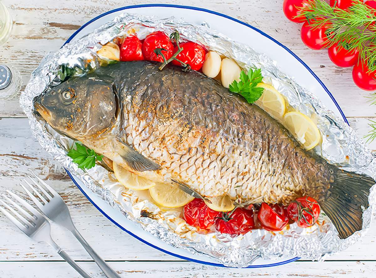 Pieczony karp z sokiem z cytryny i natką pietruszki