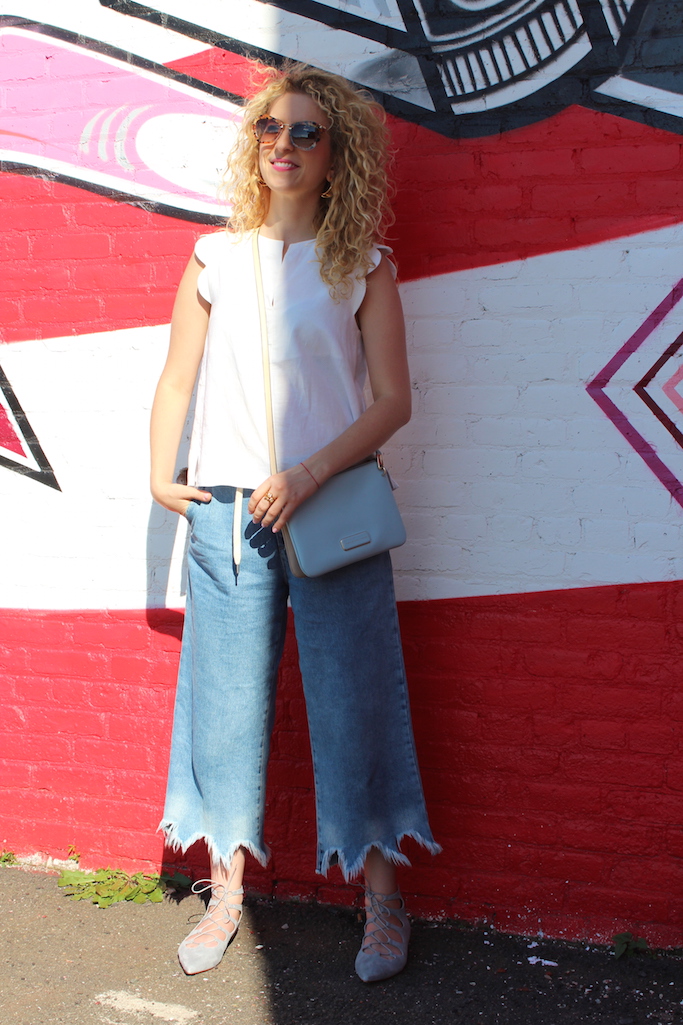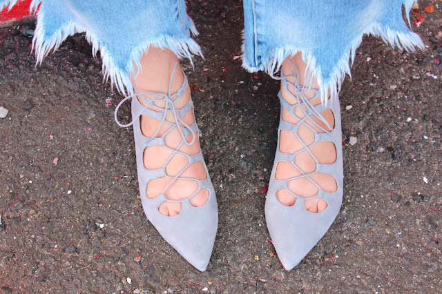 Ripped oversized jeans with lace up pointy shoes and gold bold accessories.