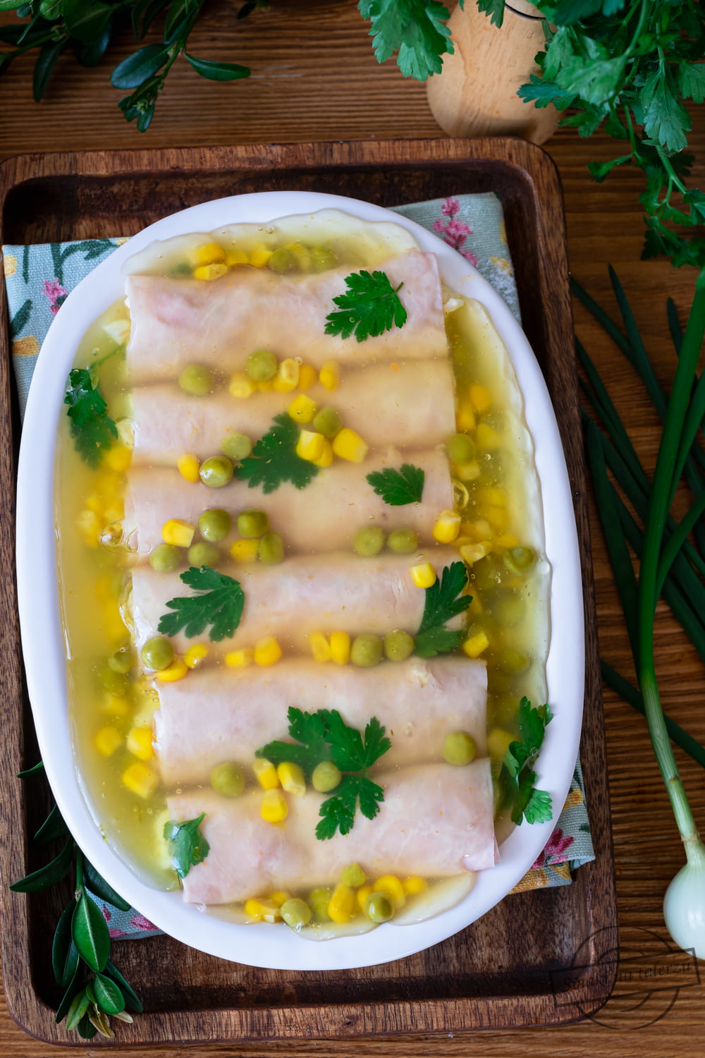 Przygotowując przepis możesz poprzestać na przygotowaniu pasty jajecznej i podać ją na pieczywie lub zrobić tak jak ja – wyłożyć pastę na plasterki dużej szynki konserwowej, zwinąć w roladki, a następnie zalać galaretą.
