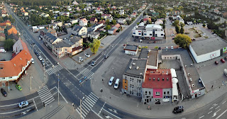 Andrespol z lotu ptaka - skrzyżowanie DW714 na pierwszym planie budynek siedziby Gminy Andrespol fot. Rafał Grabarczyk #CYKLOTURYSTA |