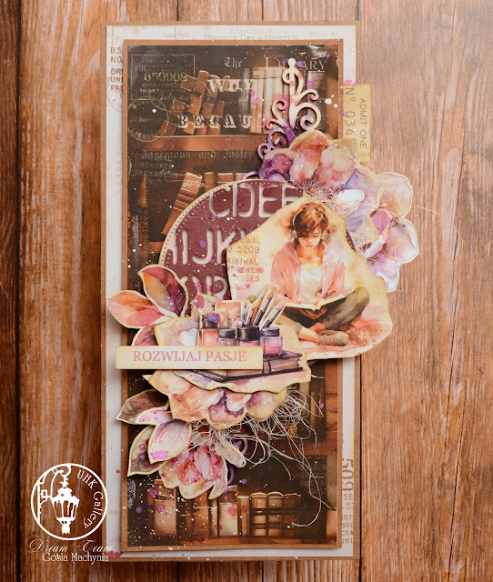 Wykorzystałam grafiki, kwiaty i napis z pasków. Do tego drobne tekturki i obowiązkowo chlapania.