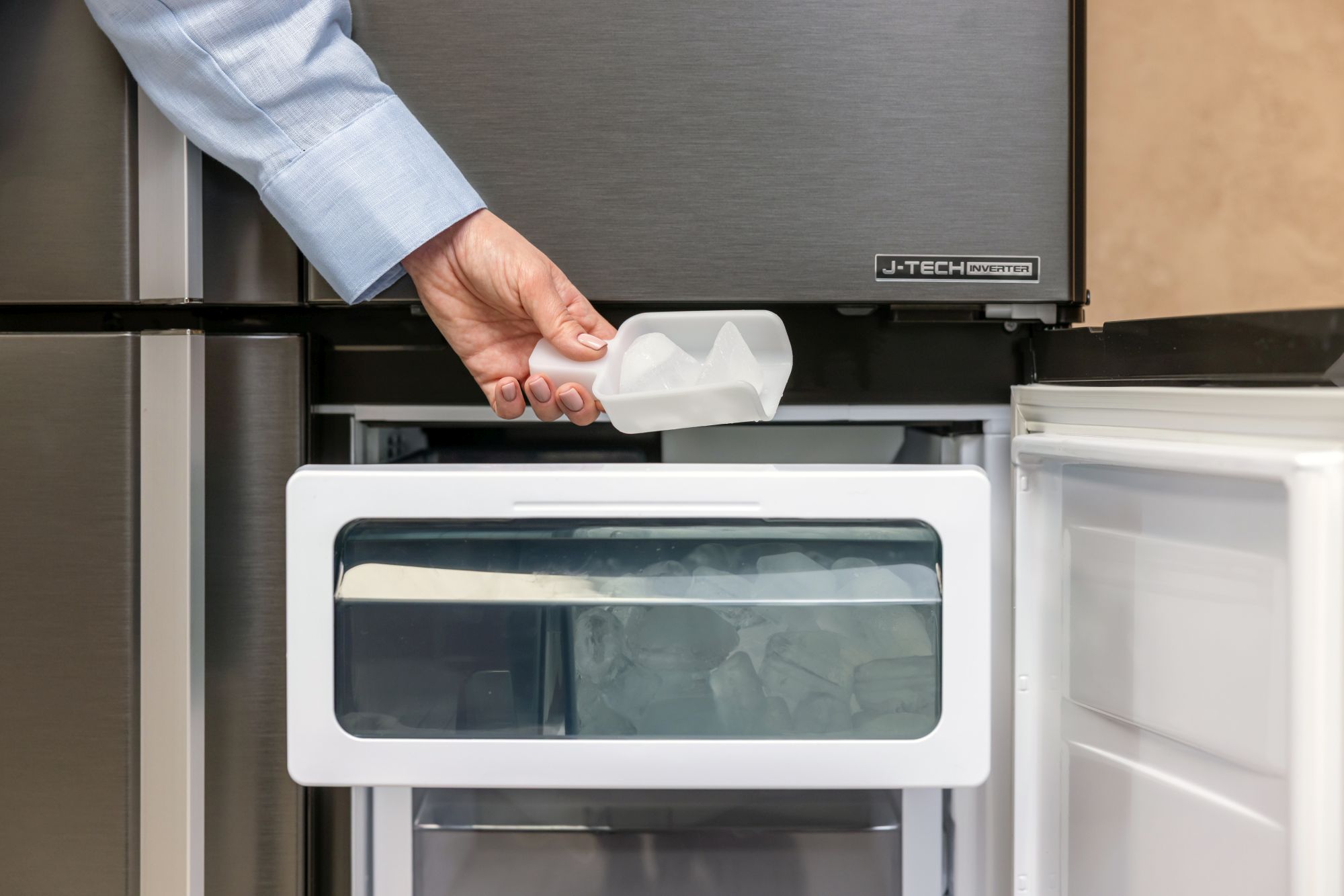 Niezależnie od zalet których nie widać (jony Plasmacluster) i nie słychać (praca lodówki), Sharp SJ-MP820C-SL to sprzęt zaprojektowany dla domowej wygody i… urody. Sprzęt wyposażony jest w automatyczną kostkarkę. Wystarczy nalać wody pitnej do 1,8-litrowego zbiornika, a urządzenie samo przygotuje kostki lodu. W zależności od potrzeb, do wyboru mamy normalny lub duży rozmiar kostek. Co ważne, nie ma potrzeby kucia ścian i podłączania lodówki do domowej instalacji hydraulicznej, czy też ustawiania lodówki akurat tam, gdzie dostęp do wody jest. Stawiasz ten sprzęt tam, gdzie Ci pasuje, a nie gdzie musisz. Ja bym postawił na widoku. Czemu? Bo ta lodówka świetnie wygląda.
