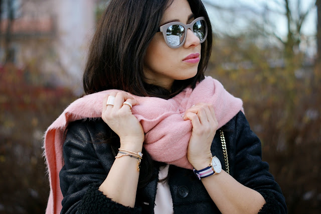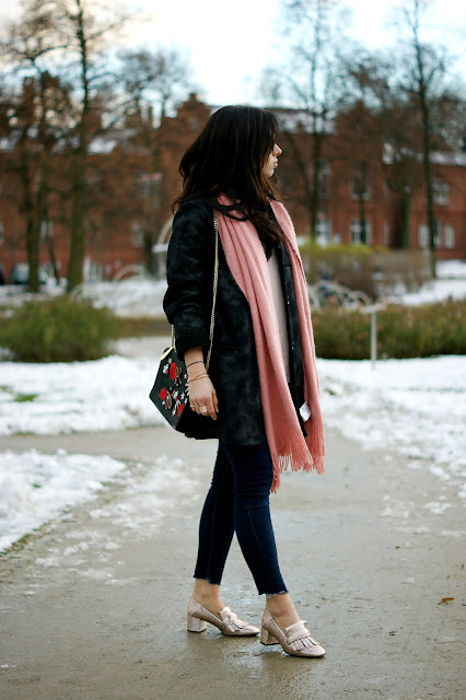 ( shirt , scarf , jewelry - H&M shoes , coat - MANGO , pants ,bag- ZARA ,glasses - RESERVED