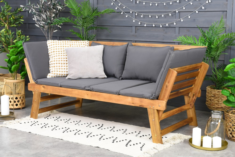 Zawsze modne są sofy ogrodowe, których konstrukcja jest zbudowana z drewna. Pasują w zasadzie do każdego ogrodu i na każdy balkon. To naturalny materiał, który nie powoduje efektu przytłoczenia. W zdecydowanej większości przypadków sofy są wyposażone w miękkie siedziska i oparcia/poduszki, np. z tkaniny poliestrowej.