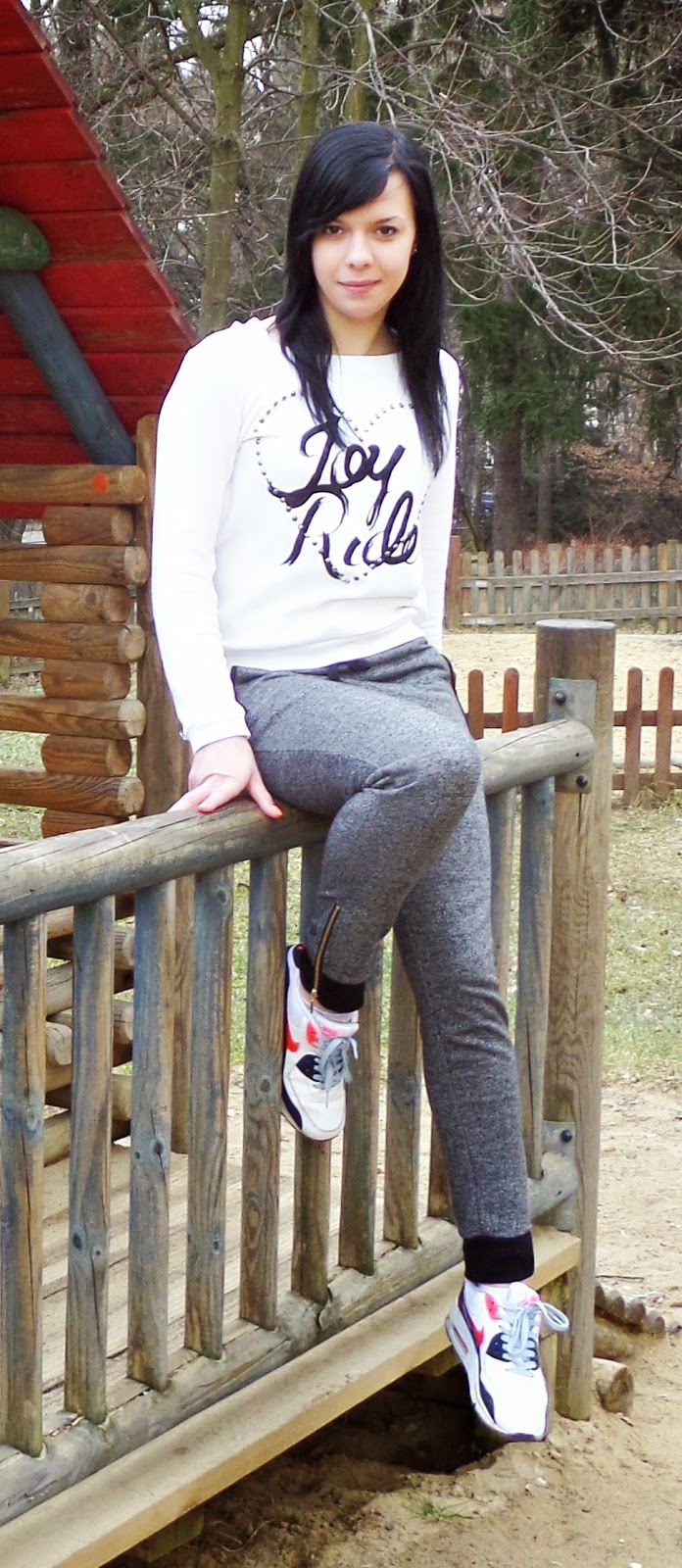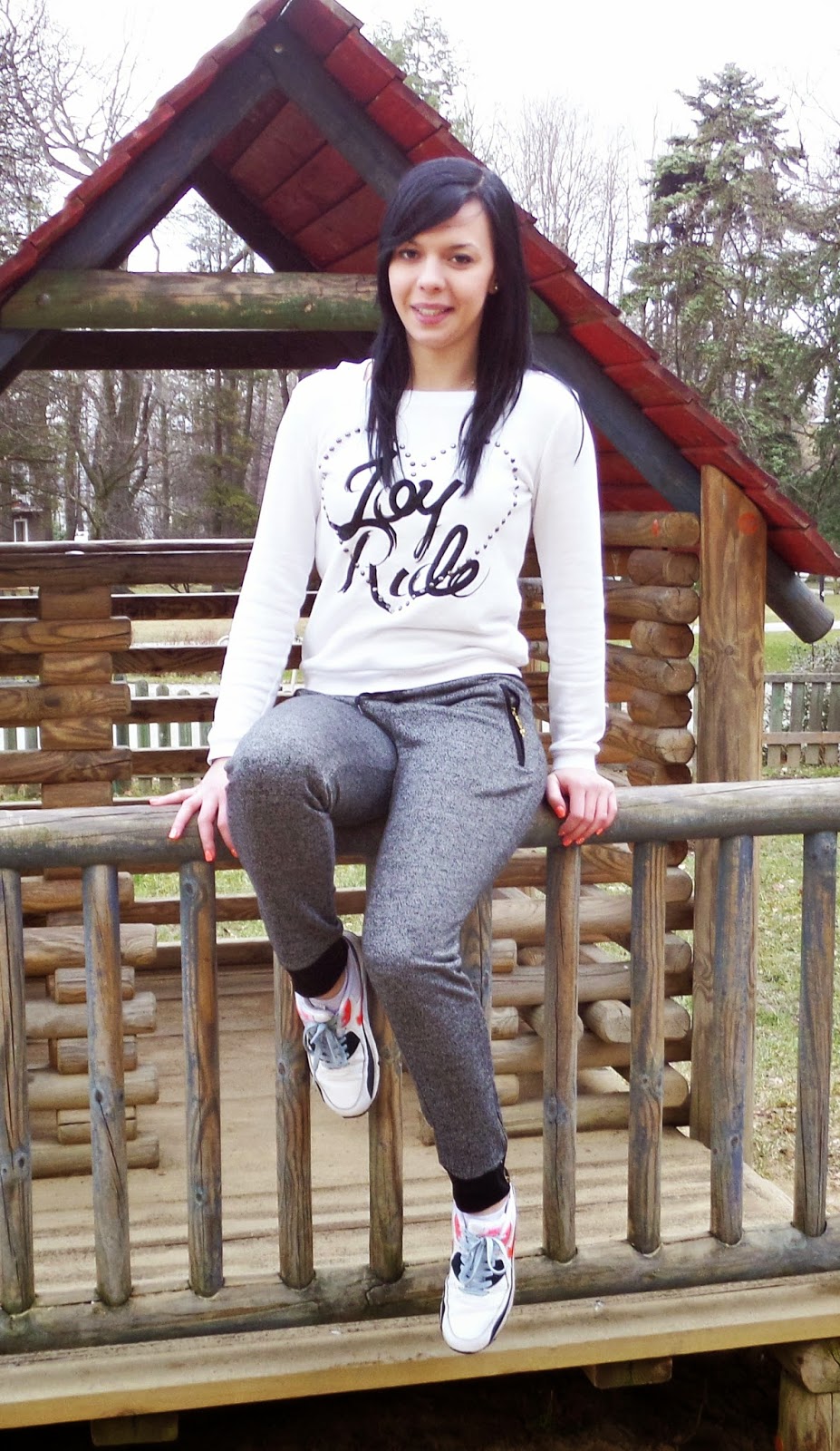 Dzisiejsza stylizacja to typowo sportowy look, w których bardzo dobrze się czuję. Cenię sobie wygodę, ale choć zawszę staram się zachować choć trochę 'dziewczęcości' w tym, dlatego też postawiłam na jasną bluzę