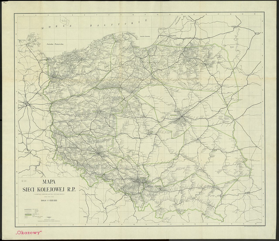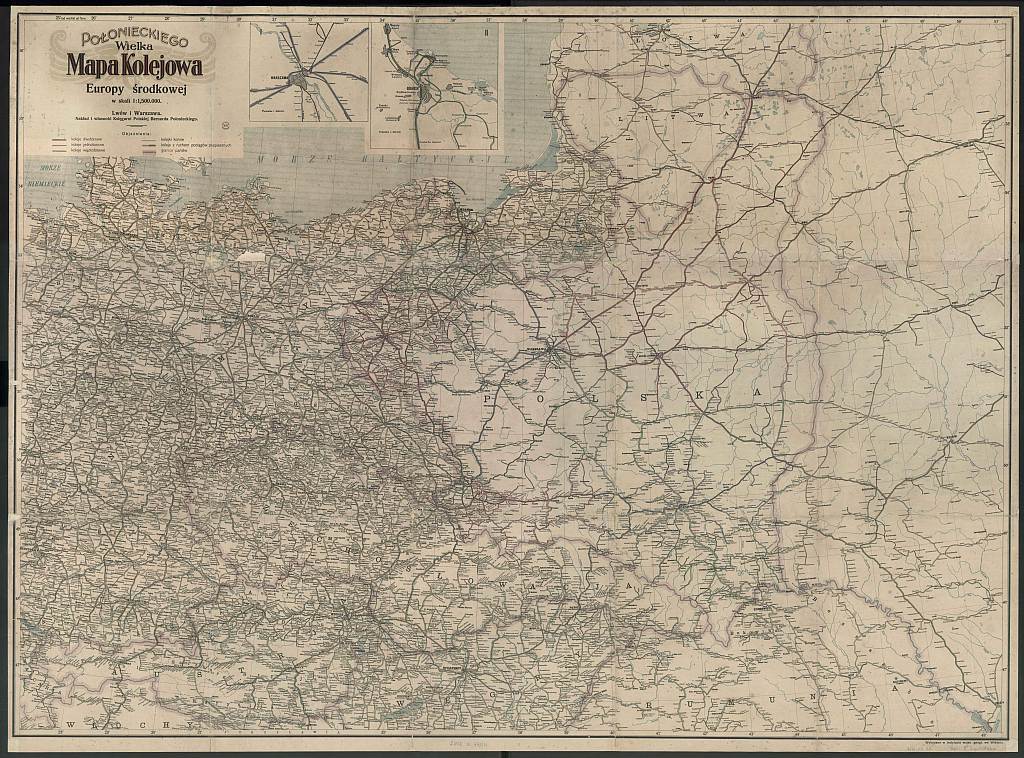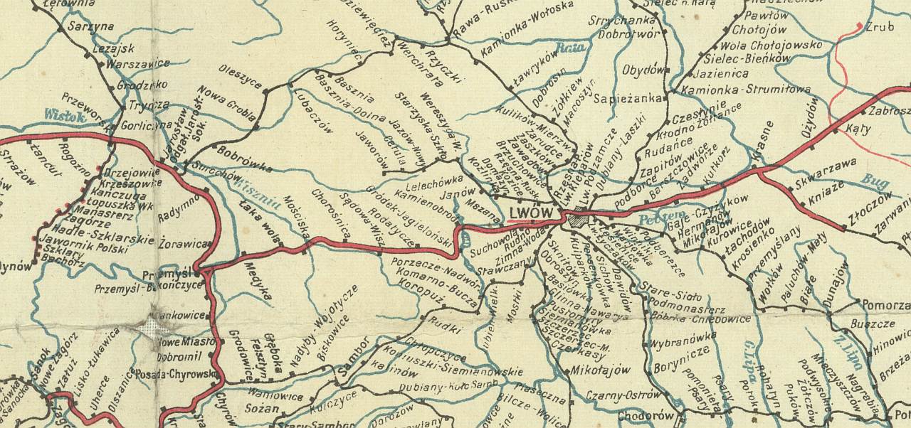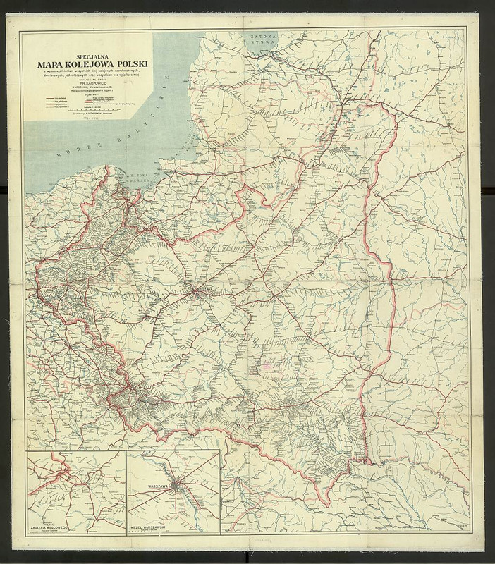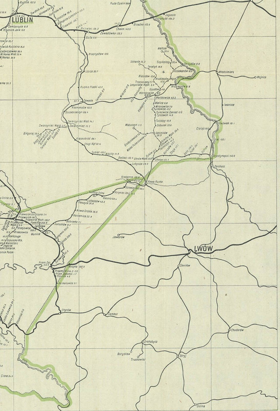 Obejrzyjmy dokładniej kolejową mapę Polski z tego samego okresu (1922). Pełna wersja jest tutaj (60 MB), natomiast poniżej jest miniaturka i fragment pełnej mapy: okolice Przemyśla i Lwowa.Ciekawostką w płn-wsch kącie pełnej mapy jest linia demarkacyjna między Polską a Litwą wyznaczająca obszar neutralny: granica między tymi państwami została ostatecznie wytyczona dopiero w 1923 roku.
