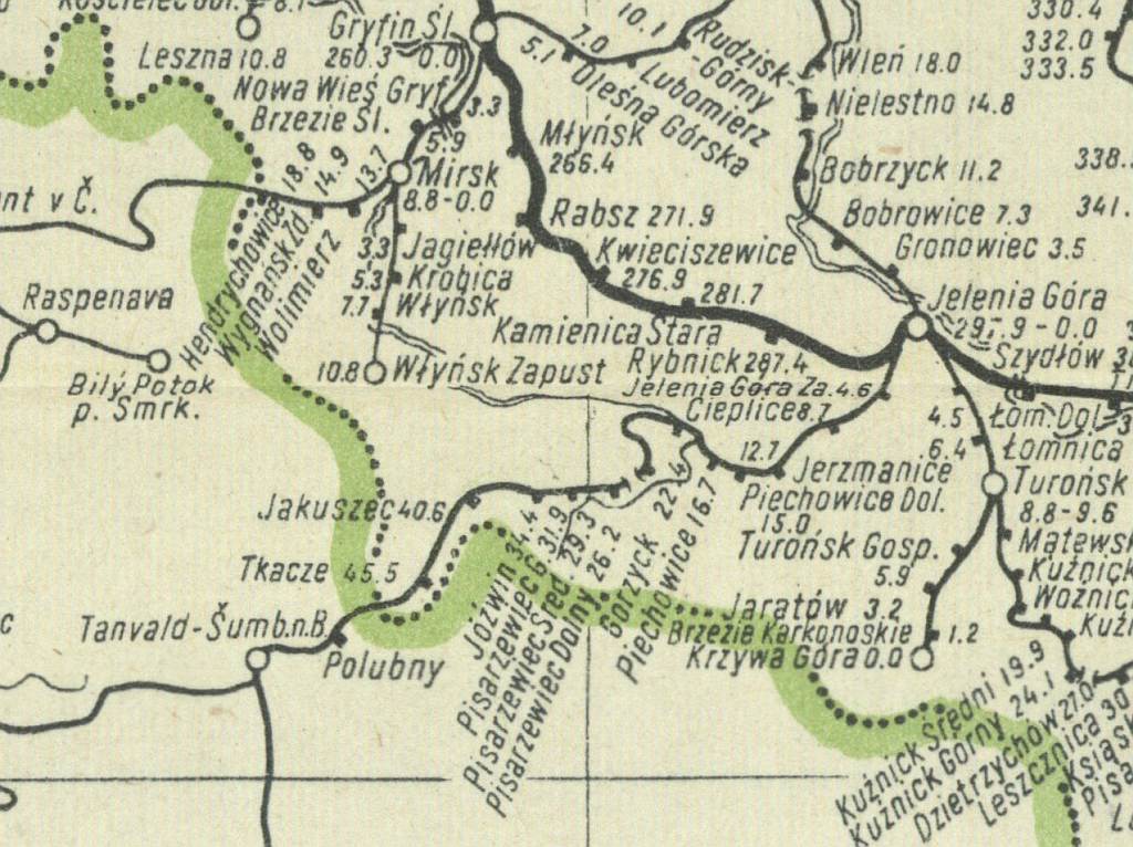 Stacja Tkacze to obecny (od 1958 roku) Harrachov w Czechach. Pisarzewiec to w tej chwili Szklarska Poręba. Stacja Jóźwin to w tej chwili Szklarska Poręba Huta. Jakuszec to w tej chwili graniczna stacja Szklarska Poręba Jakuszyce.