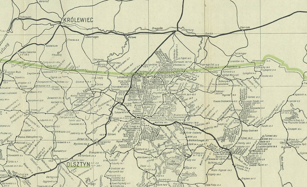 Na poniższym fragmencie pokazującym część byłych Prus Wschodnich, nazwy prawie wszystkich miejscowości są polskie albo niemieckie, sprzed drugiej wojny, choćby na terytorium ówczesnego ZSRR. Na przykład: Królewiec, Insterburg, Święta Siekierka – w tej chwili Kalingrad, Czerniachowsk, Mamonowo.