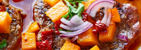 Steki z karkówki pieczone z dynią i suszonymi pomidorami to sycące, aromatyczne danie, idealne na jesienny obiad lub niedzielne spotkanie przy stole. Mięso jest soczyste w środku, a z wierzchu pięknie zrumienione, pieczone razem z kawałkami słodkiej dyni i intensywnymi w smaku pomidorami. Całość nabiera głębi dzięki przyprawom, czosnkowi i odrobinie sosu sojowego. Warto pokusić się też o dodatek kaparów. To prosty sposób na tradycyjną karkówkę w nowym, bardziej wyrazistym wydaniu.