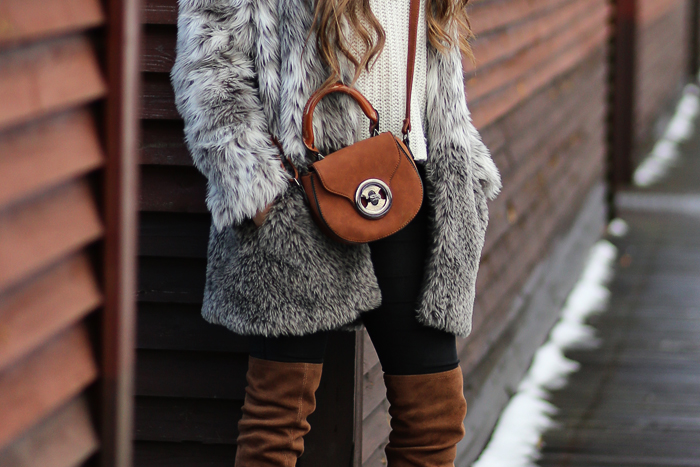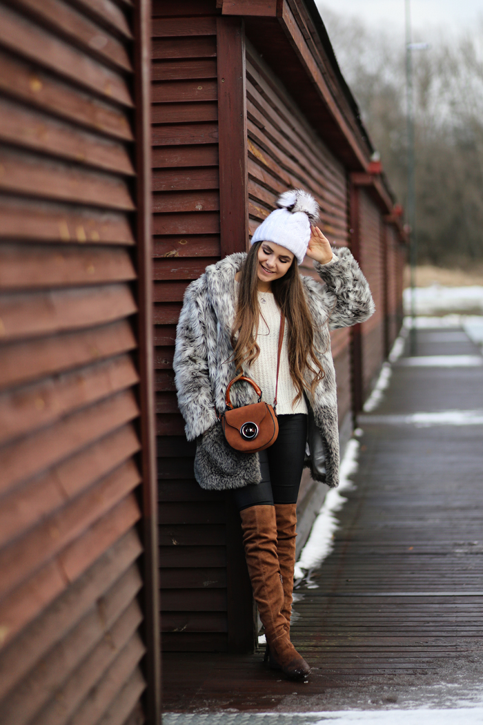 Kurtki i kamizelki z futra ponownie zdobyły swoje pięć minut. Oczywiście mowa tu o takich, dzięki którym nie ucierpiał żaden niewinny zwierzak. Są one ciepłe, modne i ekologiczne. Wręcz idealne na zimową aurę! Co roku pojawiają się zarówno na wybiegach najważniejszych domów mody, jak i w ofertach popularnych marek sieciowych. Aktualnie mamy spore możliwości, o ile chodzi o wybór kolorystyki, czy fasonu, ponieważ sklepowe półki uginają się od ich ilości. Każda z pań może wybrać coś dla siebie. Z czym więc zestawić takie futro, by wyglądać atrakcyjnie? Niestety jest to jeden z trudniejszych w noszeniu elementów garderoby. Tego typu okrycia wierzchnie mają to do siebie, iż dodają nam objętości, a co za tym idzie optycznie poszerzają naszą sylwetkę. Dzięki nim zyskujemy kilka kilogramów więcej. Najlepiej więc postawić na rurki lub cygaretki, spódnice ołówkowe albo obcisłe sukienki. Poniżej możecie zobaczyć naszą propozycję. Postanowiłyśmy połączyć futro z ciepłym sweterkiem, wąskimi, skórzanymi spodniami oraz obcisłymi butami, sięgającymi tuż za kolano. Do kozaków dobrałyśmy torebkę w zbliżonym kolorze. Pomyślałyśmy też o cieplej czapce i odpowiedniej biżuterii. Koniecznie dajcie znać, co myślicie o tej stylizacji!