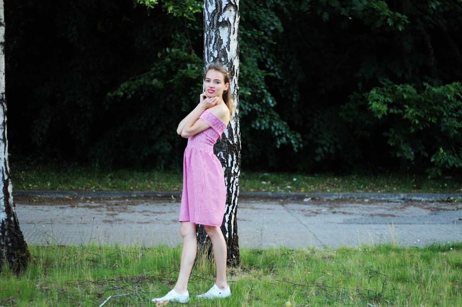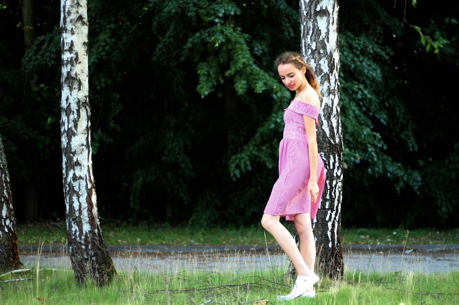 Przechodząc do zestawu... to nieskomplikowana propozycja na bardzo ciepły dzień. Dekolt hiszpański, czy też carmen jest piękny no i w tym roku to już naprawdę zasłużył na miano dekoltu roku 2018 :) O ile w poprzednim roku też cieszył się powodzeniem, to w tym zauważyłam, iż jest go na ulicach jeszcze więcej. Dekolt hiszpański pięknie akcentuje nam szyje, eksponuje obojczyki. To idealny dekolt na lato. Połączenie trampek z sukienką ma w sobie wiele dziewczęcego luzu, który lubię wprowadzać do swoich stylizacji. Jak Wam się podoba?