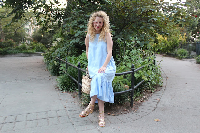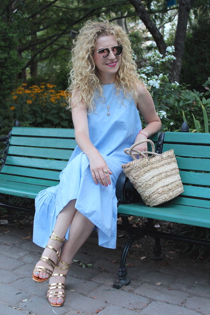 wygodna i przewiewna sukienka, złote sandały, słomkowa torebka