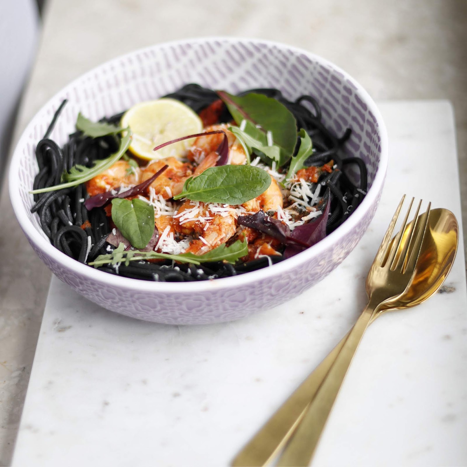 7. Porcję makaronu oblej sosem z krewetkami, posyp połową łyżki parmezanu oraz ozdób liśćmi sałaty. Podawaj z plasterkiem cytryny.