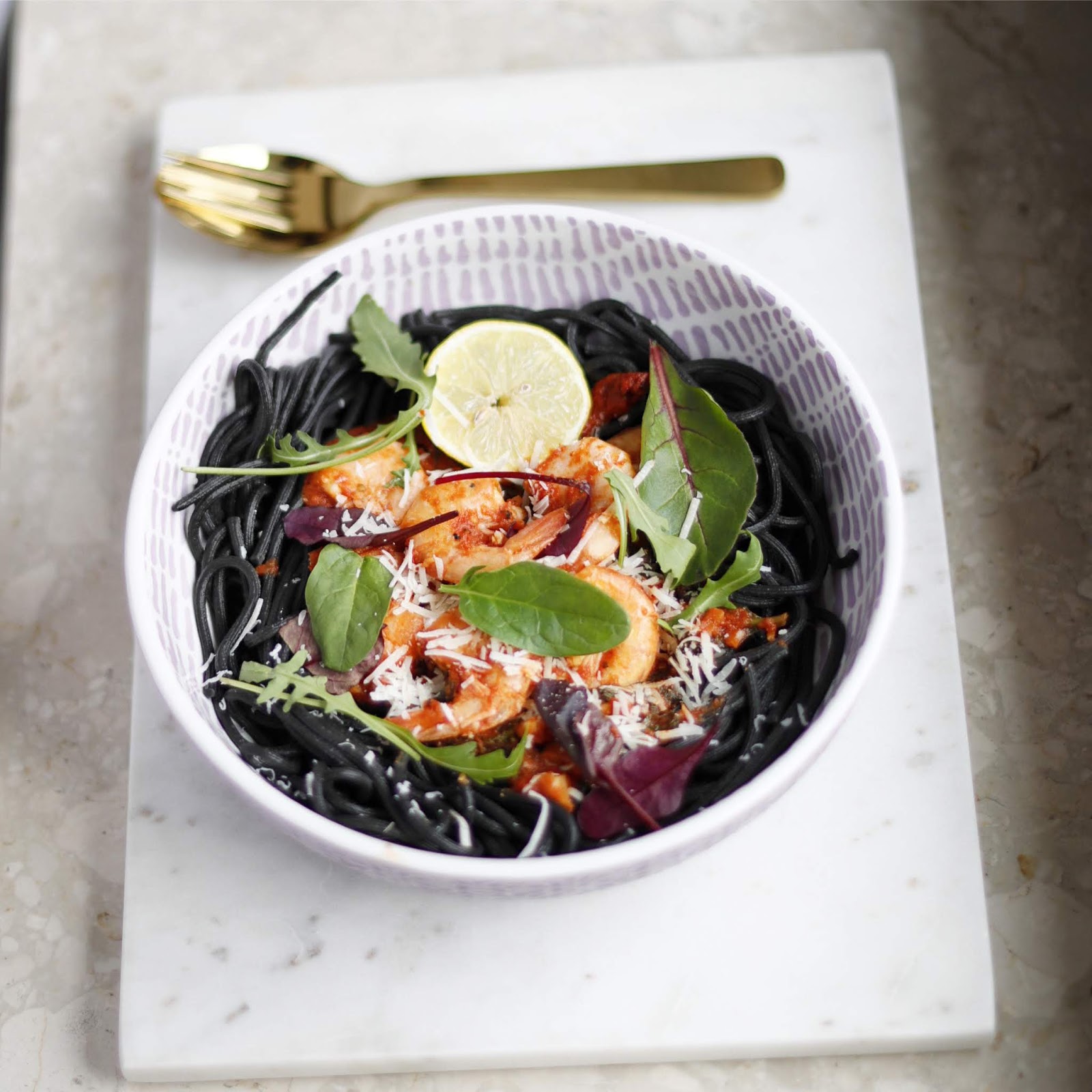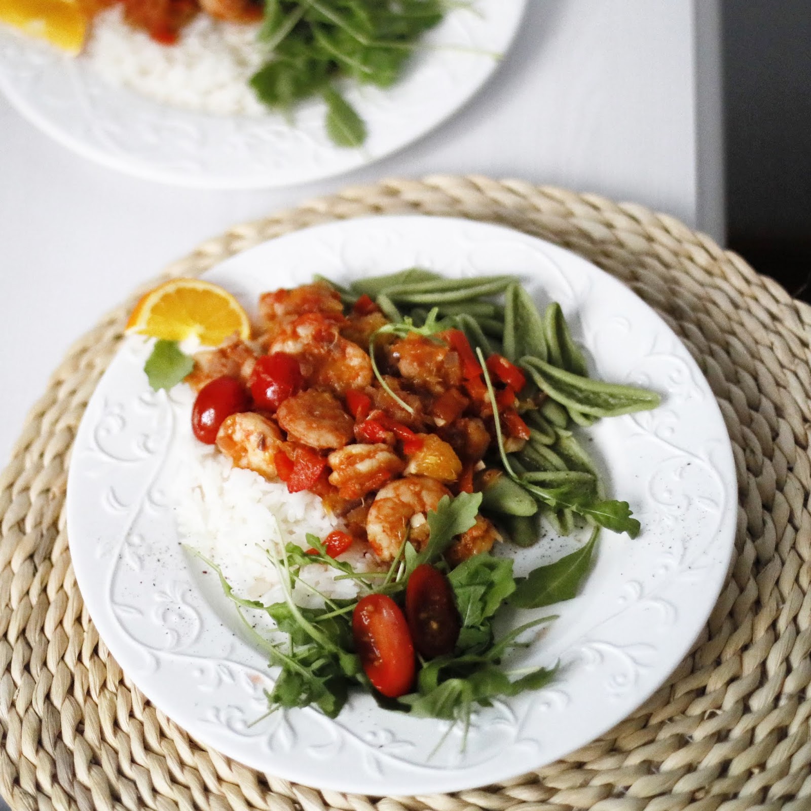 Spaghetti z krewetkami w sosie pomidorowo- pomarańczowym.