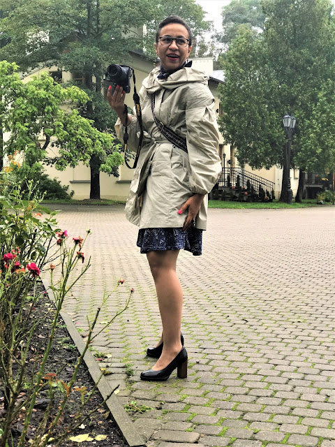 Nie testowałam płaszcza w ulewie, ale takich zwykłych deszczowych kropli nie przepuszcza. W tej stylizacji włożyłam granatową sukienkę dzianinową, a pod szyję granatową apaszkę.