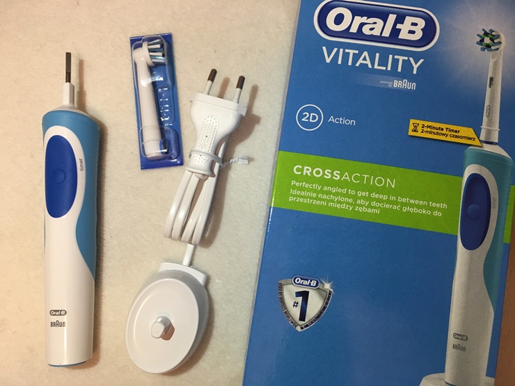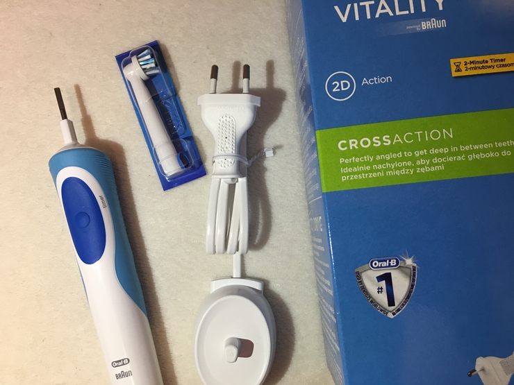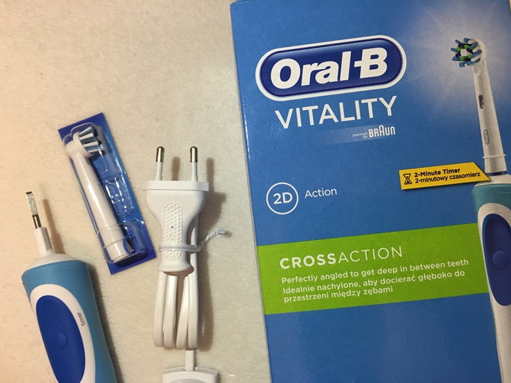 Sporo czasu minęło zanim przemogłam się i wypróbowałam pierwszą elektryczną szczoteczkę. Wybór padł na dosyć proste i niedrogie rozwiązanie, Oral-B Vitality Cross Action. Zestaw, który zakupiłam w cenie około 77 złotych zawiera 1 rączkę szczoteczki akumulatorowej, 1 końcówkę wymienną oraz ładowarkę do szczoteczki.