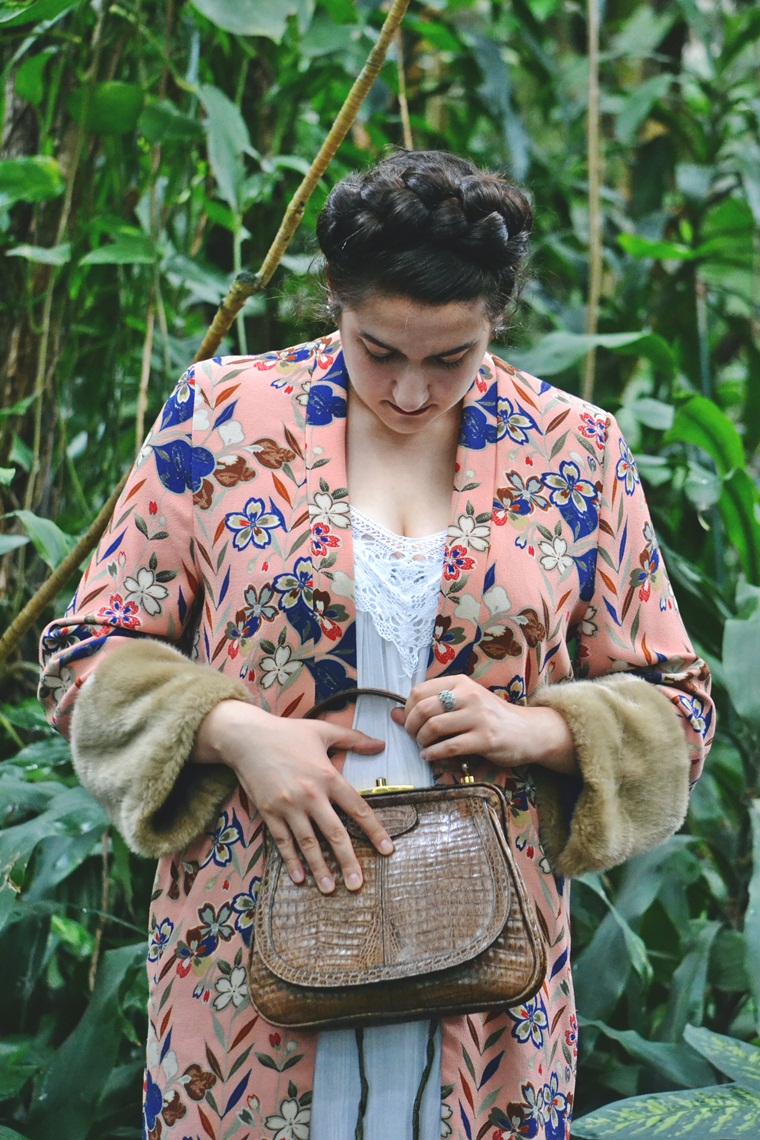 Mam na sobie ulubiony szlafrok z Zary. adekwatnie jest to płaszcz - ma podszewkę, kieszenie i uszyto go z dość grubej tkaniny (poliestrowej, niestety). Często noszę go w domu razem z piżamą, albo tak jak dziś - koszulą nocną, która pełni u mnie także rolę sukienki letniej. Jest dość prześwitująca, więc osłaniający wszystko szlafrok sprawdził się tu idealnie. Do tego kilka eleganckich dodatków i ubiór do spania gotowy na salony, czy raczej do dżungli.