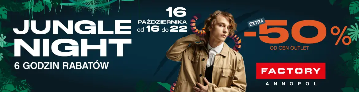 FACTORY Annopol to popularne centrum outletowe wśród mieszkańców Warszawy i całego Mazowsza, należące do największej sieci obiektów tego formatu w kraju. Na klientów czekają tam salony outletowe wiodących marek premium i średniego segmentu w stale obniżonych cenach do choćby 70%. Podczas Jungle Night zyskają dodatkowe 50% rabaty.