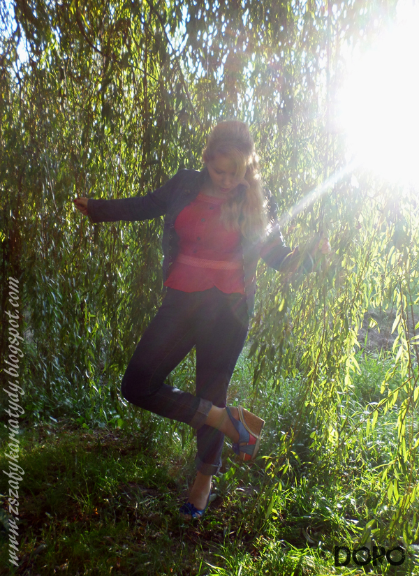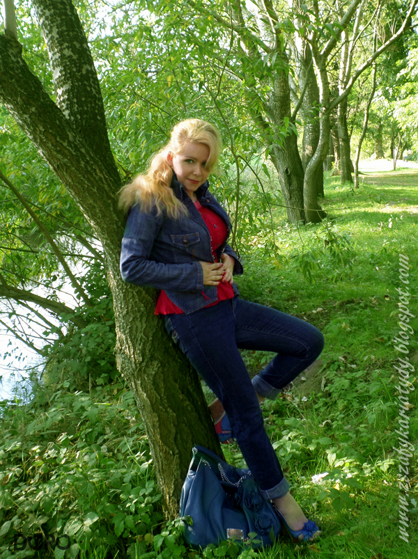 Sesja, którą zrobiłam z moją przyjaciółką była propozycją na ubiegłoroczną gorącą jesień i kto by przypuszczał, iż tegorocznego lata również będzie jak znalazł. Postanowiłam połączyć dwa skrajne kolory, mianowicie ciemny granat i soczystą czerwień. Nie wiem czy unikacie może takich połączeń ale ja je bardzo lubię kontrast jest pożądany w modowych stylizacjach. Zatem przedstawiam Wam zestaw red&blue jaki udało mi się wykombinować. Zacznę od góry. Mam na sobie ciemno niebieską kurtkę, o bardzo ciekawym kroju ze stojącym kołnierzem, która jest zapinana na haczyki dlatego idealnie opina sylwetkę, dzięki czemu wygląda się smuklej w takim modelu. Wykończona jest bardzo fajnymi dużymi miedzianymi guzikami na rękawach i w klapie kołnierzyka. Kurtka jest marki "Love Jeans" całkiem udany zakup, bo pasuje również do jeansowych spódniczek. Bawiąc się zasadą kontrastu w dzisiejszej stylizacji wyszukałam w mojej szafie karminową koszulę. Bardzo ją lubię kupiłam ją kilka lat temu przypadkowo w Biedronce i nie żałuję. Ma długi rękaw wiązany na tasiemki i szalenie kobiecy krój. Zastanawiam się czy nosicie takie koszule. Ta, którą Wam prezentuję to tzw. baskinka, czyli bluzka z falbanką u dołu. Koszula tego typu jest wymarzona dla Pań o budowie ciała określanej jako "klepsydra" oraz dla osób o budowie ciała zbliżonej do "kolumny" lub "prostokąta". Dlaczego? Kształt falbanki sprawia, iż optycznie uwypuklają się biodra a talia wydaje się bardziej szczupła. o ile macie taką budową ciała proponuję częściej sięgać po baskinki, które ukrywają również niewielki brzuszek...pod warunkiem, iż jest widoczny :) To tyle o trikach związanych z baskinką. Przejdźmy do dołu stylizacji. Ubrałam do tego zestawu denimowe jeansy z wysokim stanem. Ostatnio taki krój spodni wrócił do łask i bardzo się cieszę z tego powodu. Ponieważ nie zawsze spodnie kończące się na wysokości pępka pasują do każdej stylizacji. Nie mówiąc o budowie ciała. o ile bluzka jest krótsza powinno się zastosować zdecydowanie taki model spodni.