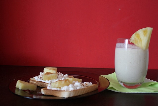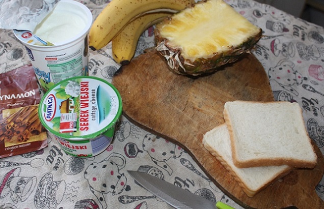 jogurt i mieszamy razem. Ananasa kroimy w plasterki i obieramy ze skórki. Opiekamy