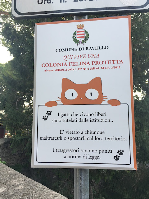 Zanim zameldowaliśmy się w naszym kolejnym hotelu, mieszczącym się w samym sercu miasteczka to udaliśmy się na krótki spacer wzdłuż jego uliczek. Charakterystycznym miejscem jest zdecydowanie główny plac miasteczka, czyli Piazza del Duomo, na którym oprócz kilku sklepów, kawiarni i restauracji znajduje się także katedra. Stamtąd też bardzo gwałtownie można dotrzeć do Villa Rufolo (wstęp jest płatny) - my tym razem tam nie wchodziliśmy. Na samym placu, jak i zresztą na terenie całego Ravello spotkacie na swojej drodze mnóstwo kotów, które są nieodłącznym elementem tego miasteczka.