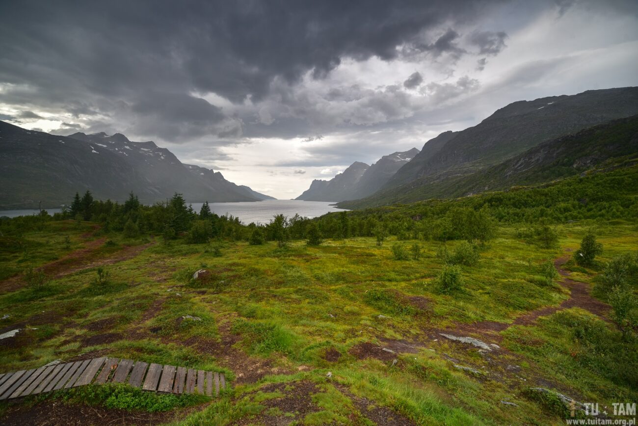 Kolejny cel programu to punkt widokowy Ersfjord. Po drodze jednak zatrzymaliśmy się we wspomnianej i polecanej kafejce. Miała być tylko kawka i ciastko, ale jak zobaczyliśmy podawaną pięknie zupę rybną postanowiliśmy spróbować. No po prostu niebo w gębie, tak nam smakowała. Na dodatek skonsumowana na tarasie restauracji z widokiem na marinę miasteczka Tromvik (fot. w akapicie WRAŻENIA I ORGANIZACJA). Bardzo nam się tu podobało. Tak bardzo, iż nie chciało nam się opuszczać tego miejsca. Jednak dwa ostatnie cele czekały, a czas uciekał. Po około 40 minutach odpoczynku w knajpce ruszyliśmy na parking, z którego ścieżka przyrodnicza z małymi platformami widokowymi doprowadza na Ersfjord.