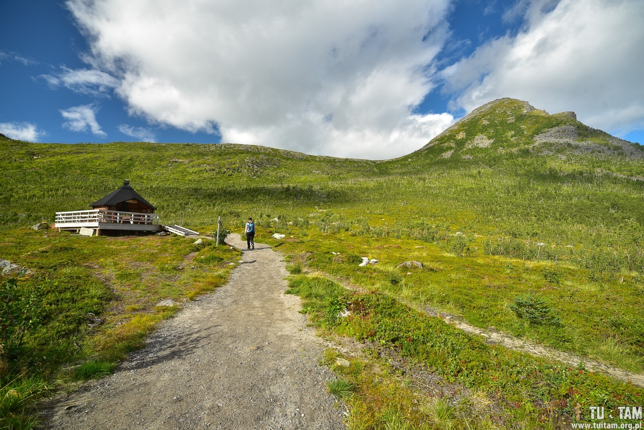 Nie trzeba samochodu terenowego. Miejsce pokazujemy na naszej mapce. Po około 30 minutach ruszyliśmy z plaży na parking, gdzie znajduje się punkt startowy na szlak na Brosmetinden. Tutaj dobrze jest mieć auto chociażby z wyższym zawieszeniem, bo droga szutrowa z dziurami odczuwalnie zmniejsza komfort jazdy. Jednak dojeżdżają tu również auta osobowe, więc zachowując ostrożność każdy dojedzie. Szlak pokazujemy na poniższej mapce, na której nagraliśmy ślad naszej wędrówki. Jak widać nie jest on ani długi, ani obciążony dużą różnicą wysokości do pokonania, więc po powrocie nie będziemy specjalnie zmęczeni.