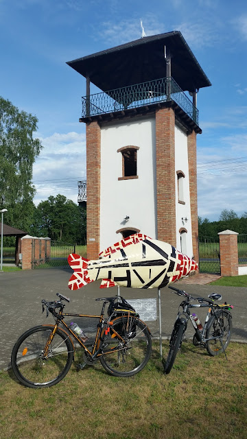 Przy wjeździe na kemping stoi wysoka wieża a na jej czubku znajduje się głowa białego daniela. Tuż pod wieżą rozpoznajemy KOLOROWEGO KARPIA! - jesteśmy na terenie Parku Krajobrazowego Doliny Baryczy.
