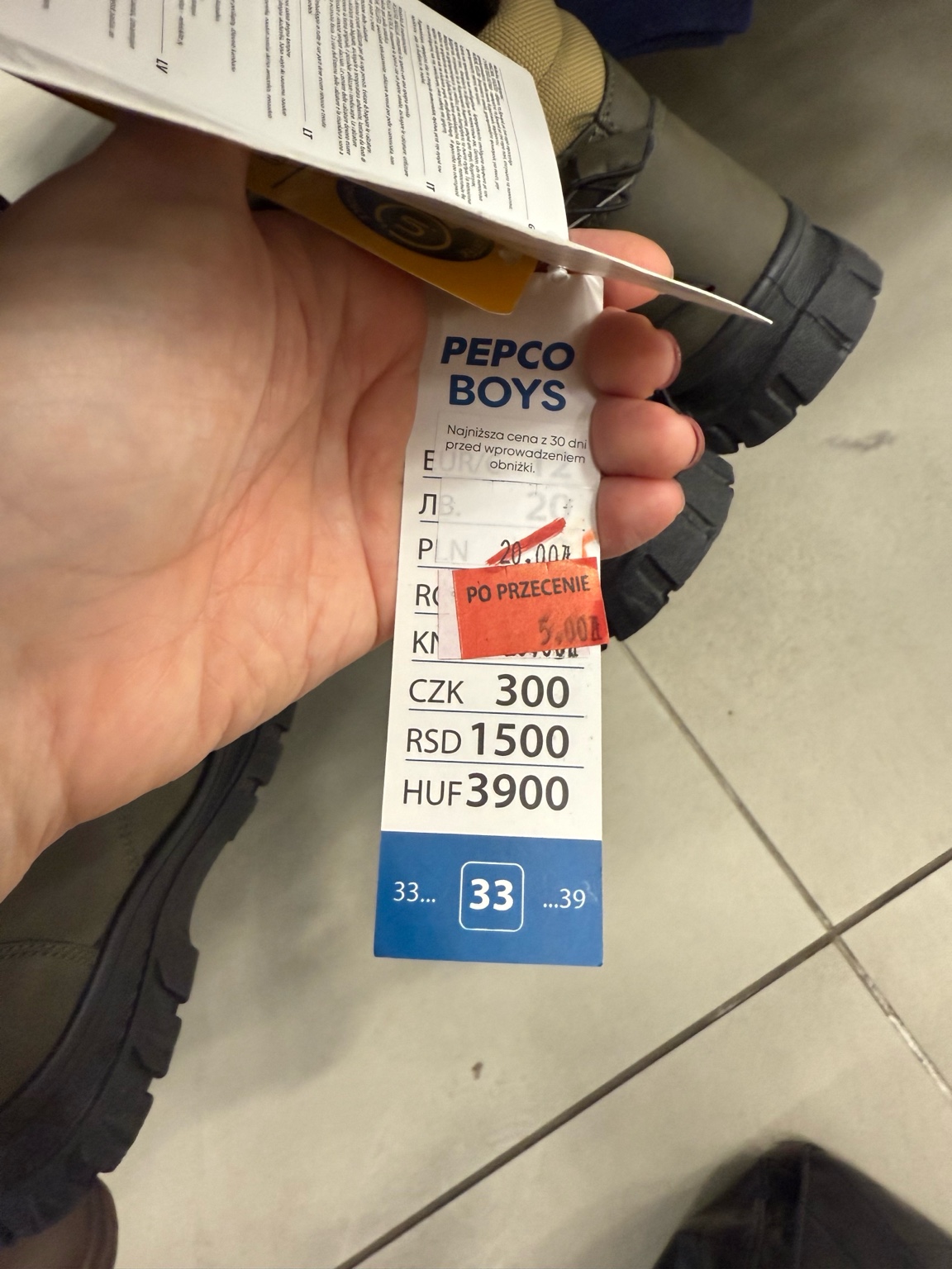 Na zdjęciach zrobionych w sklepie widać wyraźne naklejki z cenami po przecenie oraz paragony potwierdzające zakup butów za 5 zł.