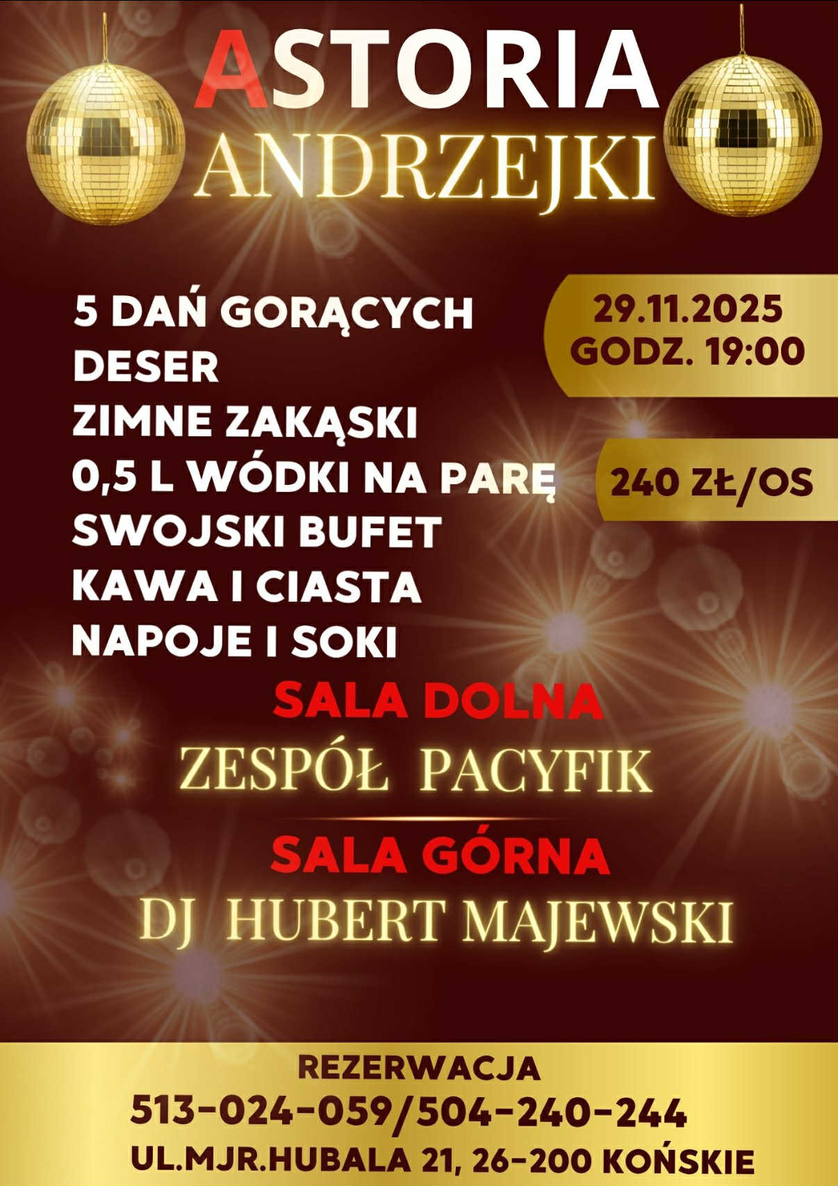 Cena udziału to 240 zł za osobę. Zabawa rozpocznie się 29 listopada 2025 roku o godzinie 19:00 w Astorii przy ul. mjr. Hubala 21 w Końskich. Rezerwacje przyjmowane są pod numerami telefonów: 513 024 059 oraz 504 240 244.