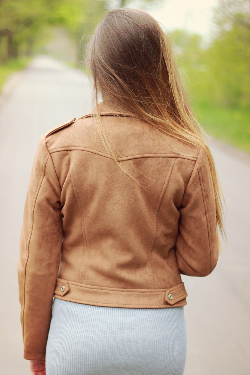Przyznam, iż kurtka, która jest w dzisiejszym wpisie przysłowiowym "gwoździem programu" to pierwszy a'la zamszowy element mojej garderoby. Wcześniej mimo wszechobecnych stylizacji z udziałem podobnych kurtek nie ogarnęła mnie euforia na ich punkcie. Idealna propozycja dla osób, które znudzone są ramoneskami z eko-skóry - ta wersja zdecydowanie przypadnie Wam do gustu. Zestaw niezwykle prosty, ale całkowicie przepadłam na jego punkcie. Do tego czarne rajstopy, które idealnie dopełniają całość.
