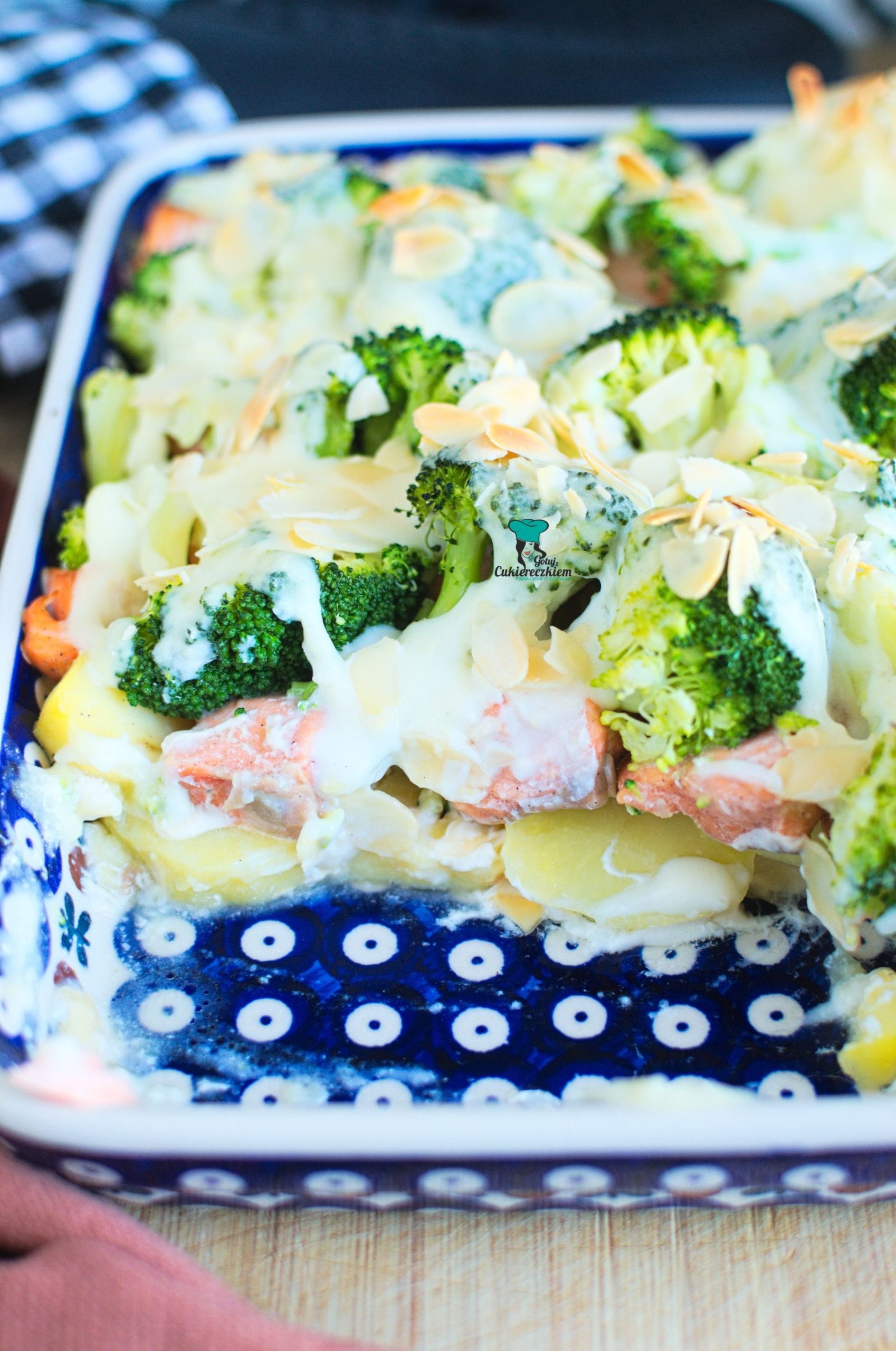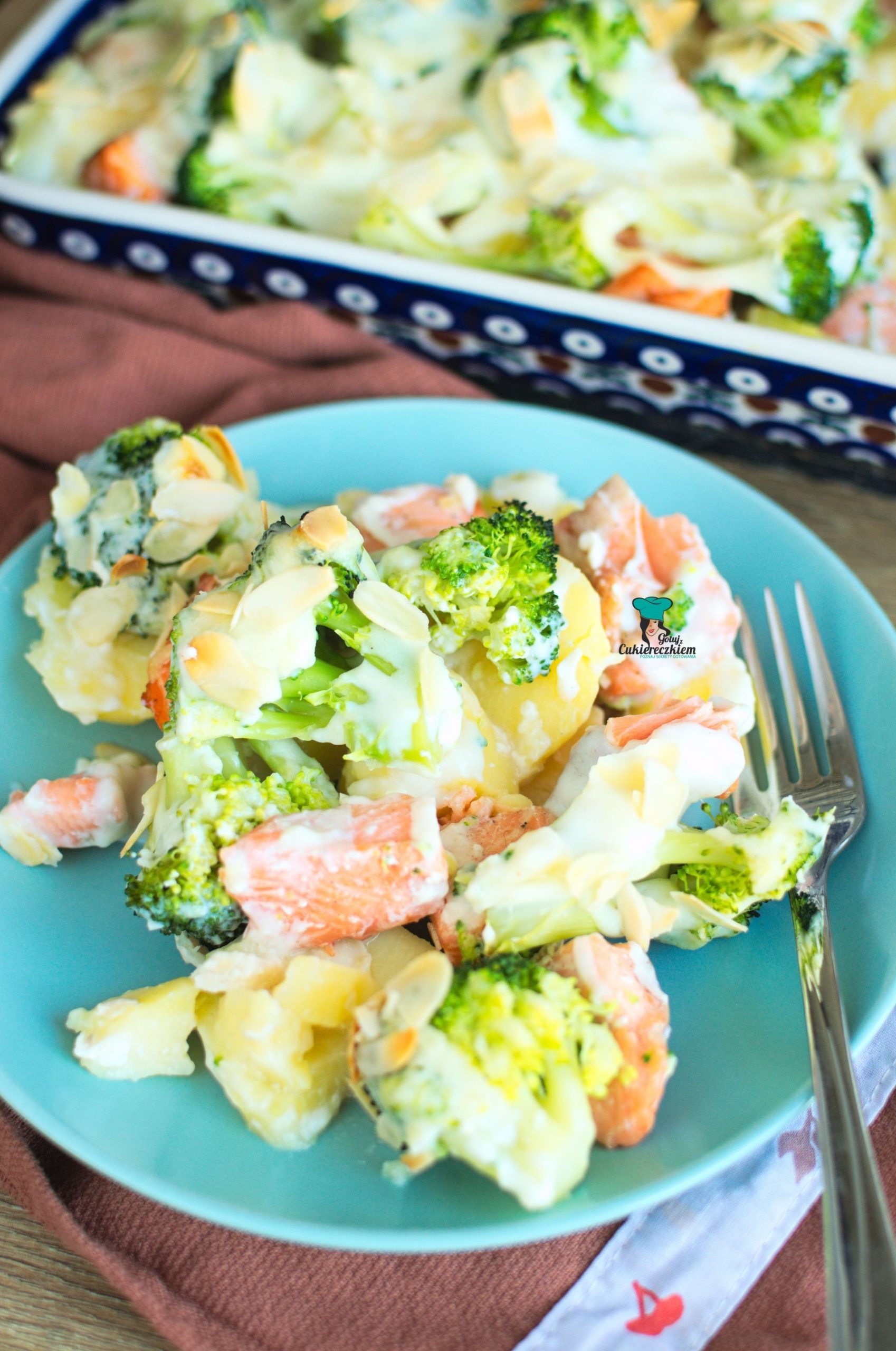 Łososia jemy co najmniej raz w tygodniu. Najczęściej zabieram go do pracy w towarzystwie ryżu/kaszy bulgur i ugotowanych brokułów. Lubię podawać go także w towarzystwie frytek i surówki z białej kapusty. Ale dziś chce Wam zaproponować nowość. Jest to zapiekanka ziemniaczana z kawałkami łososia, różyczkami brokuła i sosem beszamelowym. Zapiekanka jest dość prosta i szybka do przygotowania. Wszystkie składniki można przygotować wcześniej, a przed podaniem tylko razem zapiec. Zapiekanka super się też odgrzewa. Polecam!